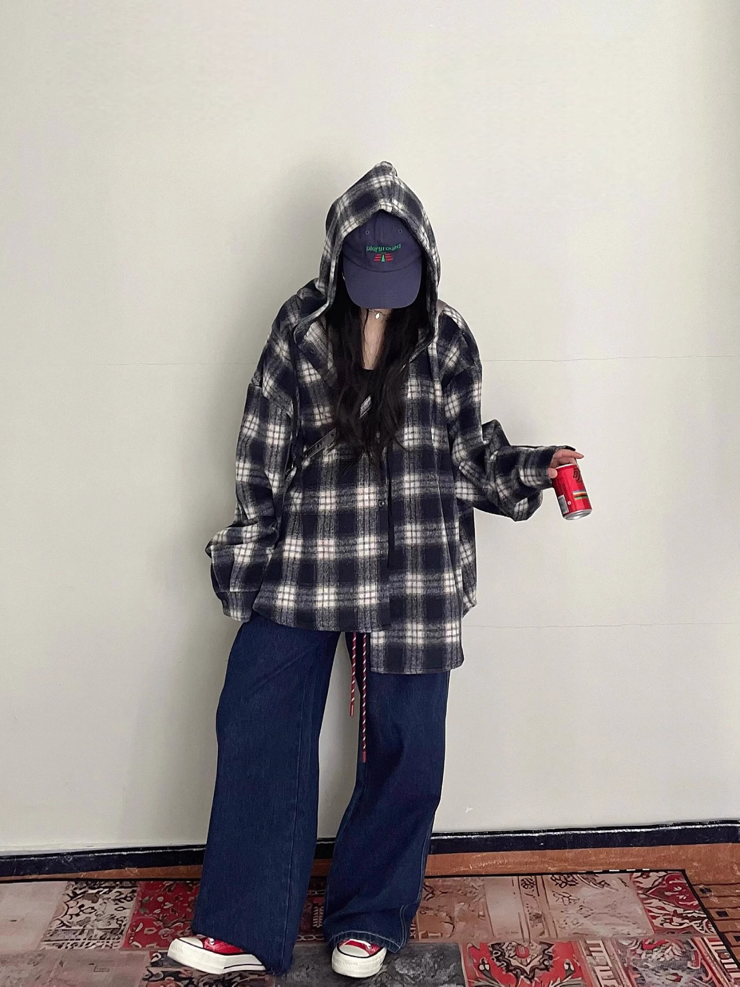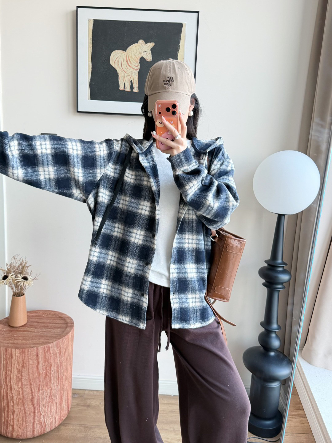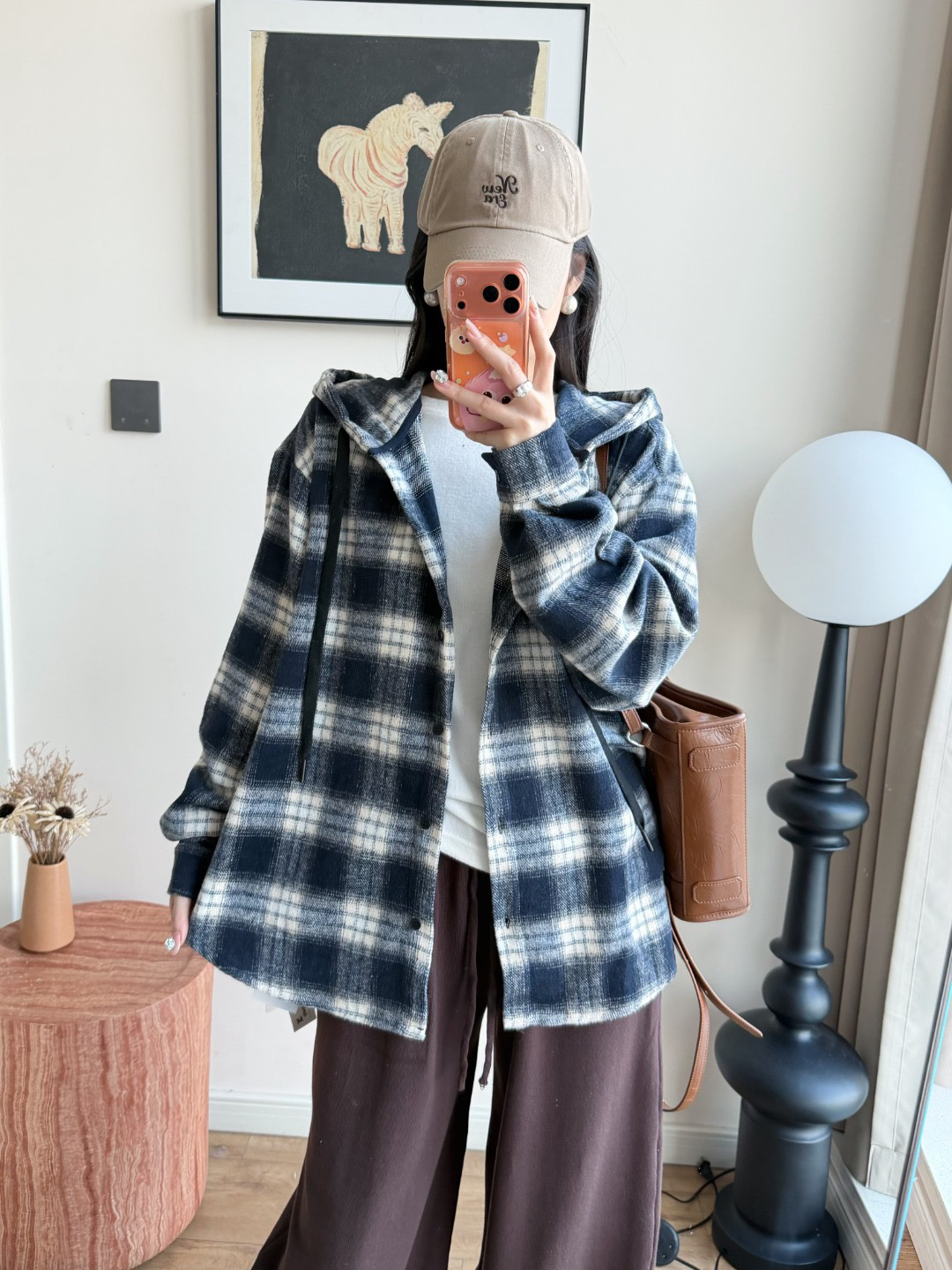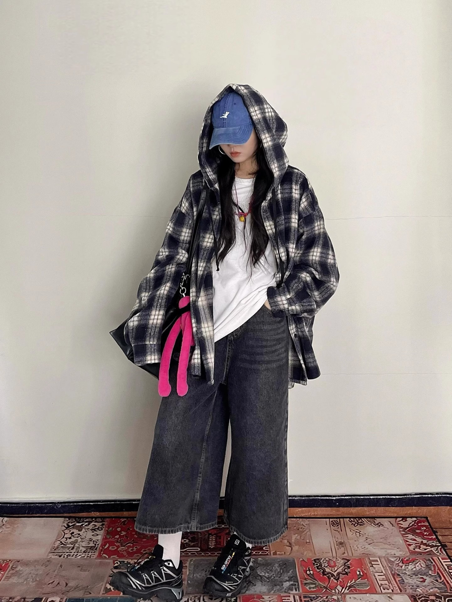 衬衫式拼接帽子的设计 更能弱化格纹的板正感!双层超大体量的帽子 戴上帽子松弛度真的拉满~