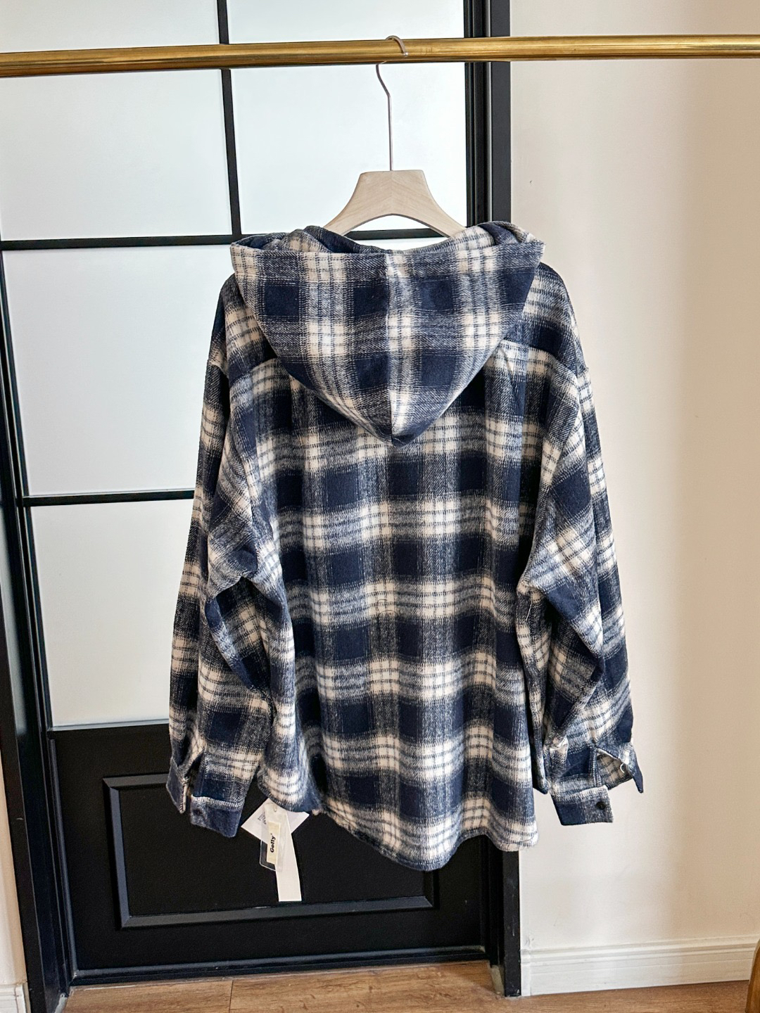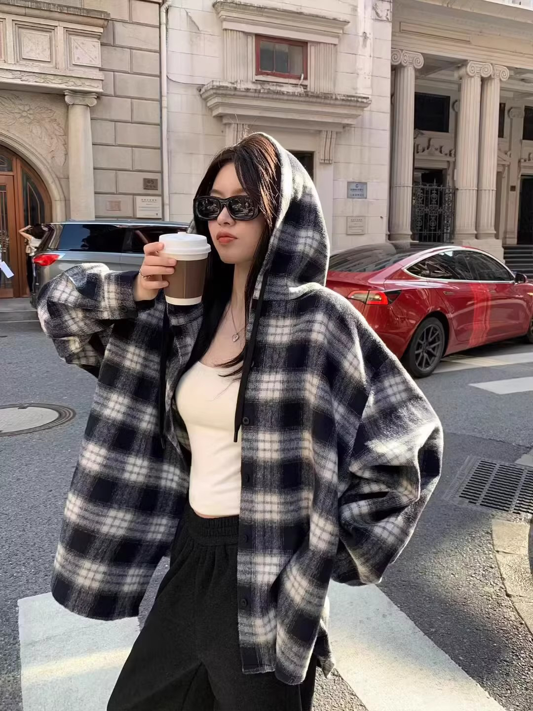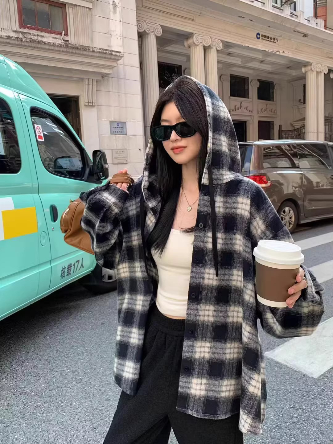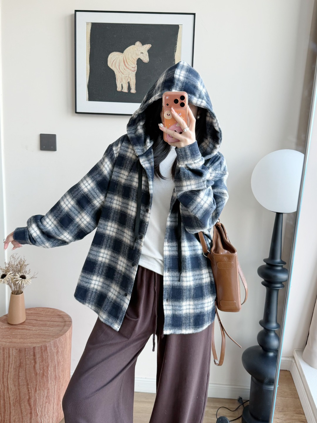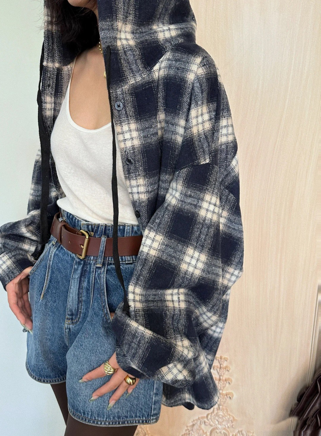 衬衫式拼接帽子的设计 更能弱化格纹的板正感!双层超大体量的帽子 戴上帽子松弛度真的拉满~