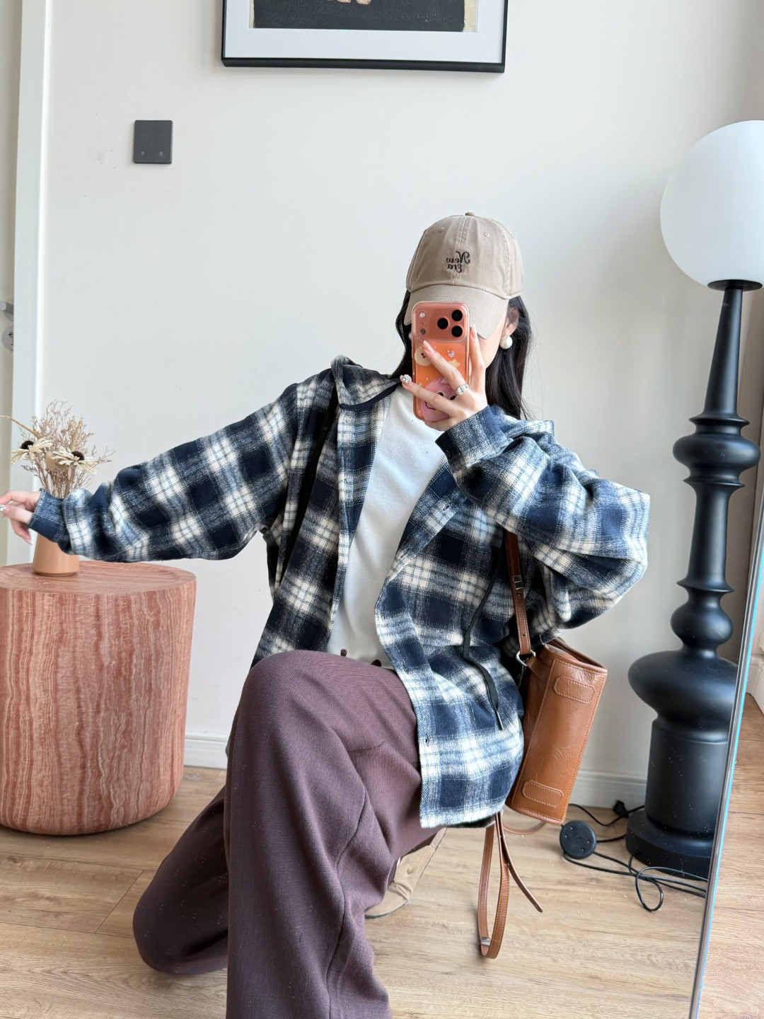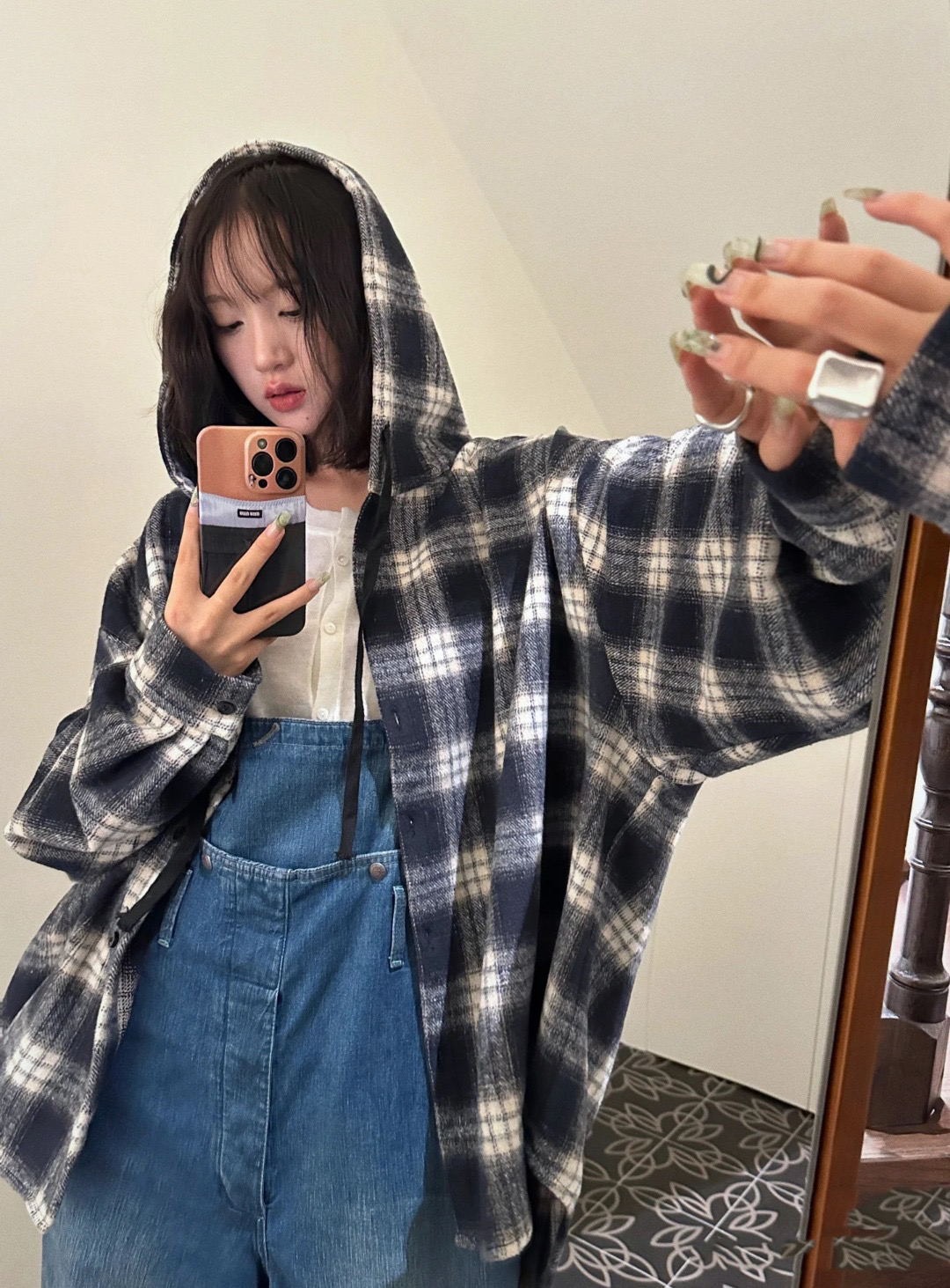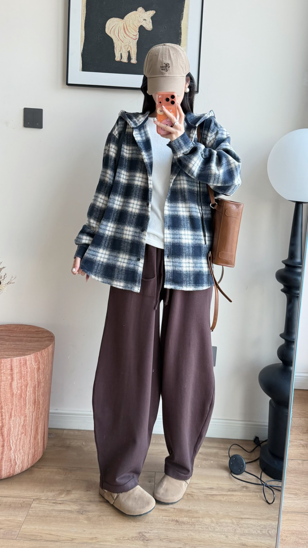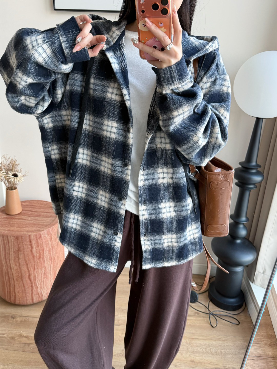 衬衫式拼接帽子的设计 更能弱化格纹的板正感!双层超大体量的帽子 戴上帽子松弛度真的拉满~