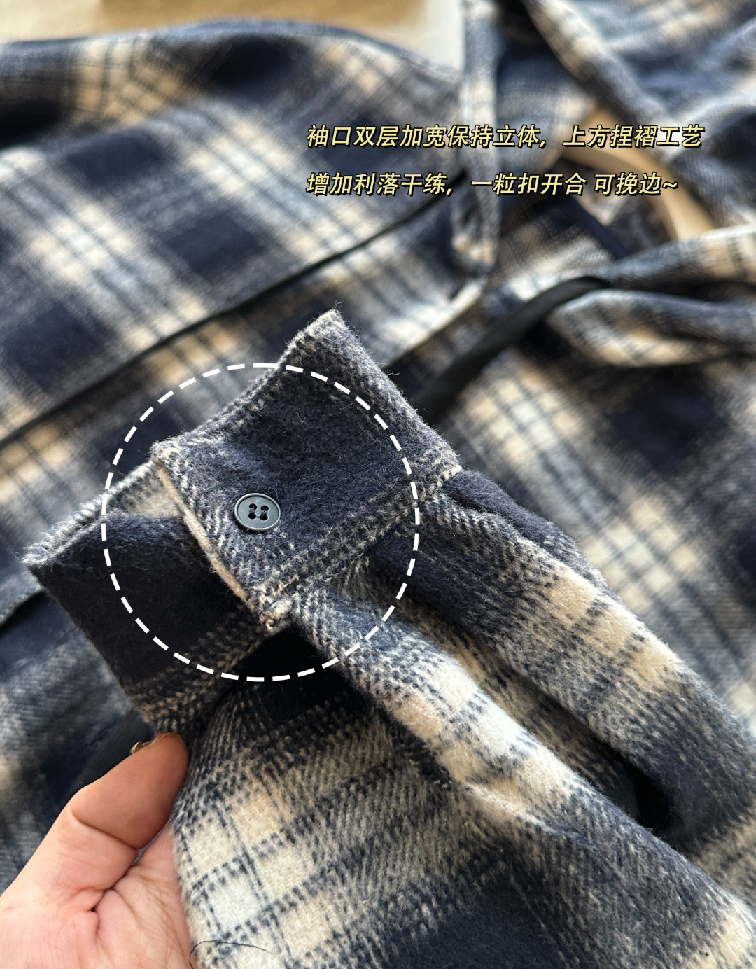 袖口双层加宽保持立体,上方捏褶工艺增加利落干练,一粒扣开合 可挽边~
