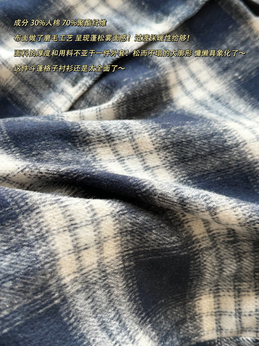 成分 30%人棉 70%聚酯纤维布面做了磨毛工艺 呈现蓬松雾面感!过渡保暖性给够!
