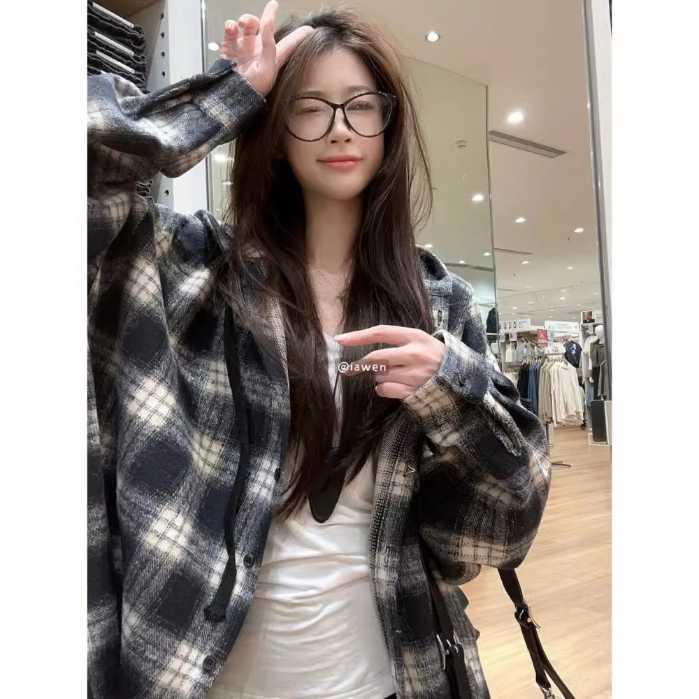 迪丽热巴 李雯浩同款~韩国rauc*复古连帽格子衬衫~这也太太太好看啦!
