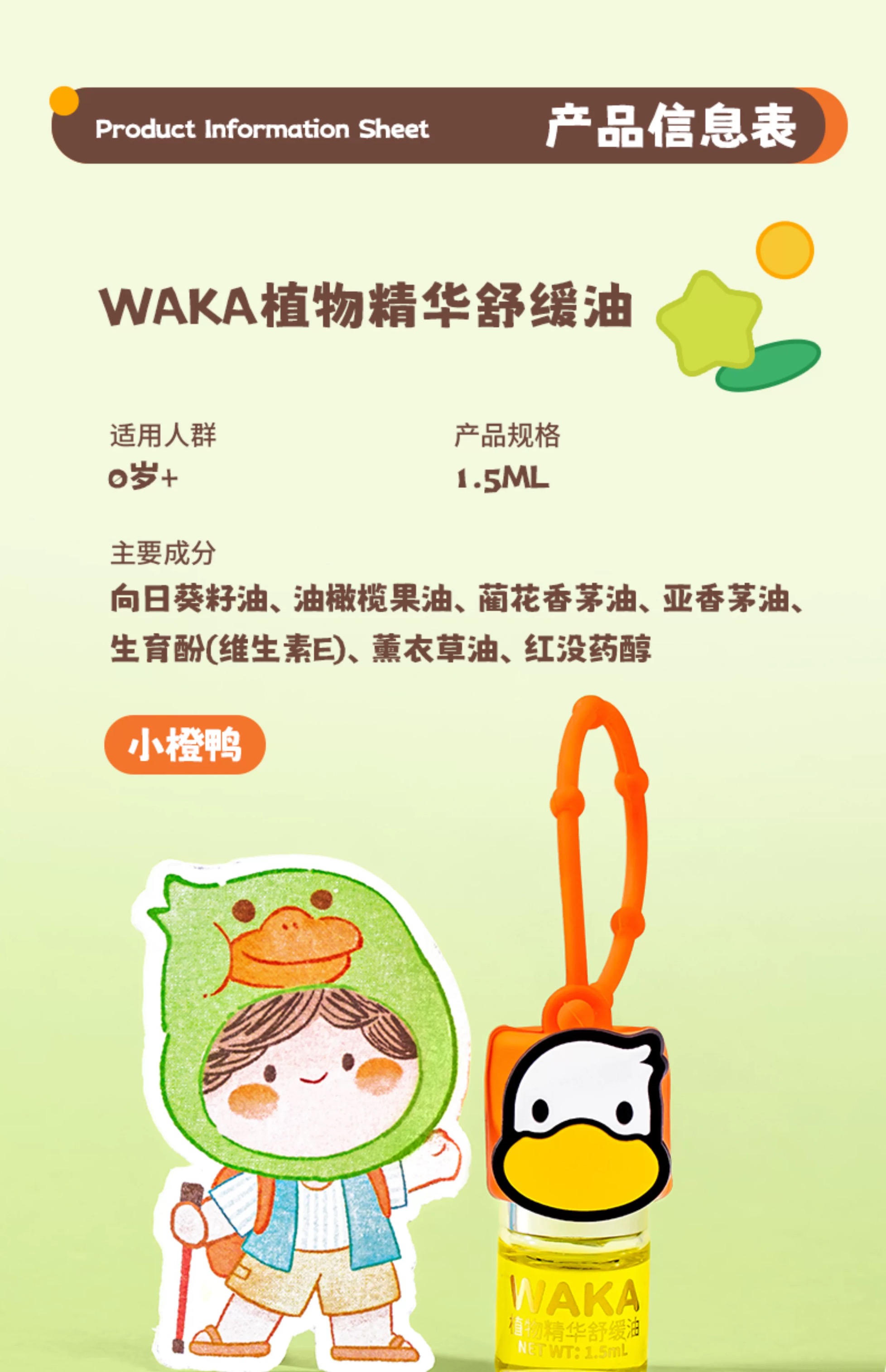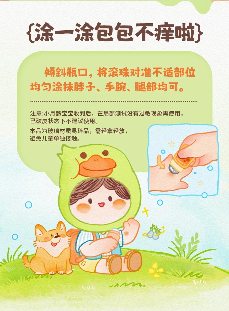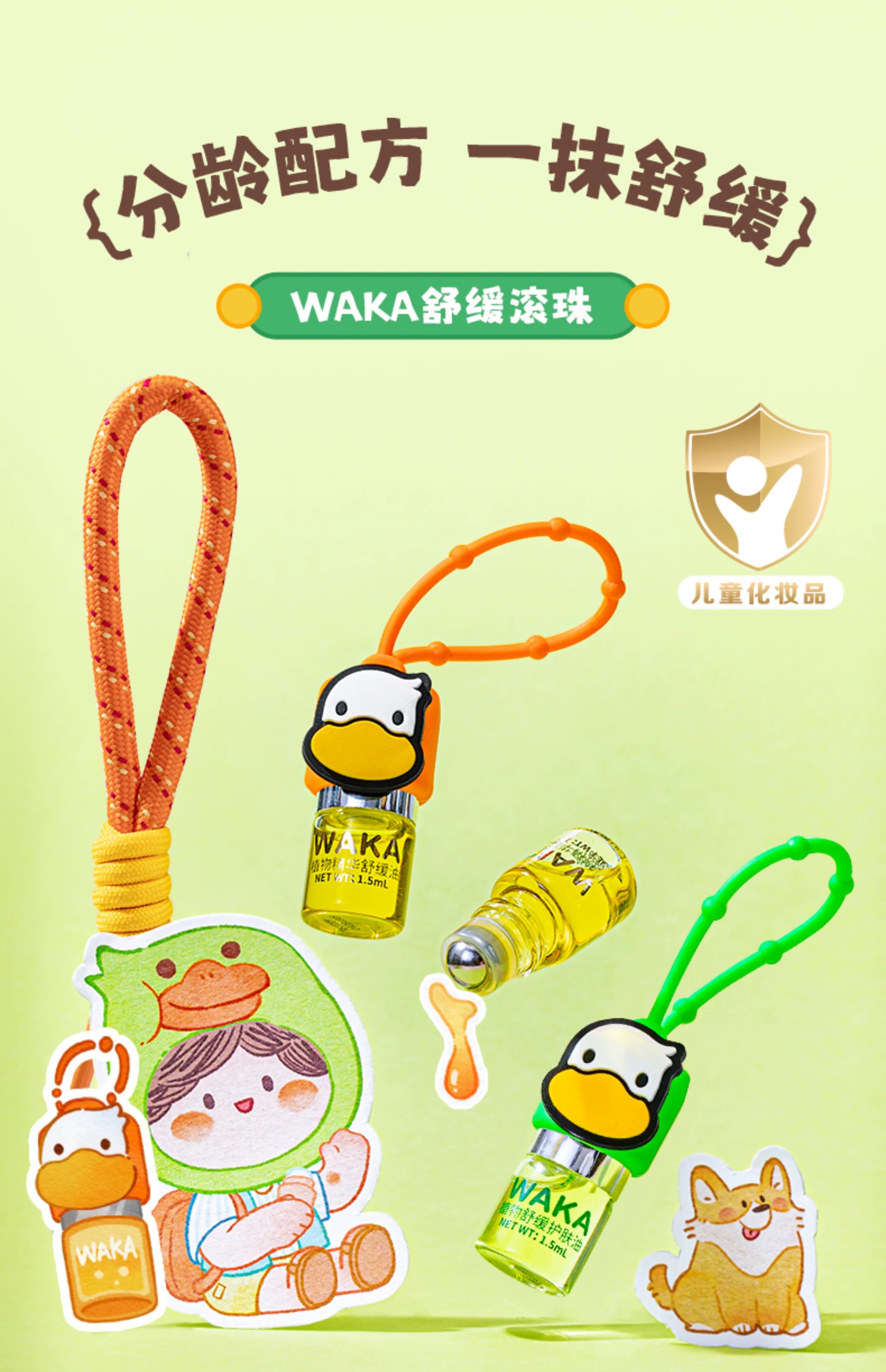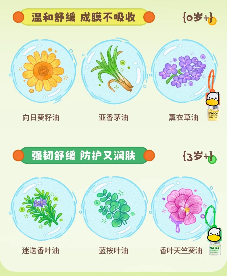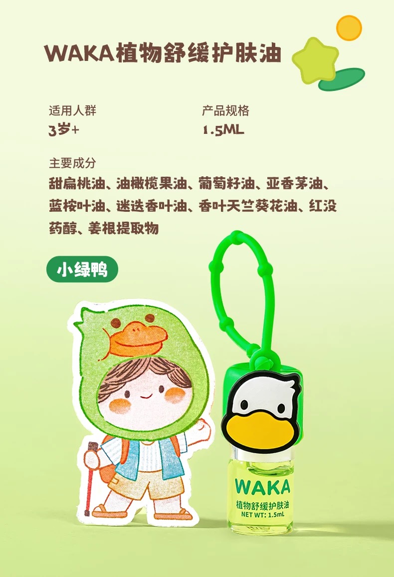 WAKA分龄精油舒缓滚珠婴儿童蚊虫叮咬止痒走珠便携小橙鸭小绿鸭
