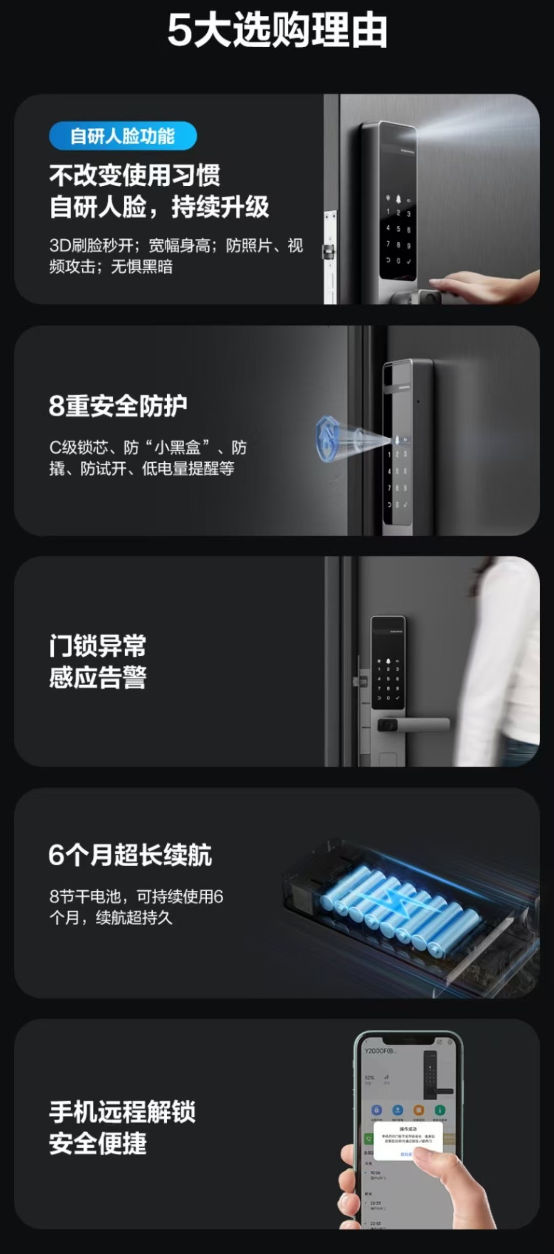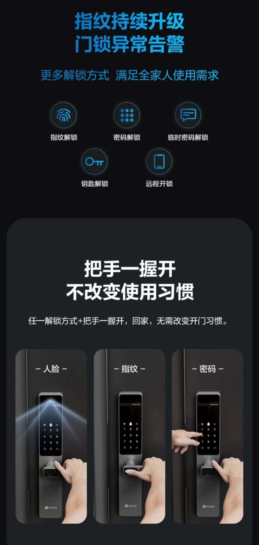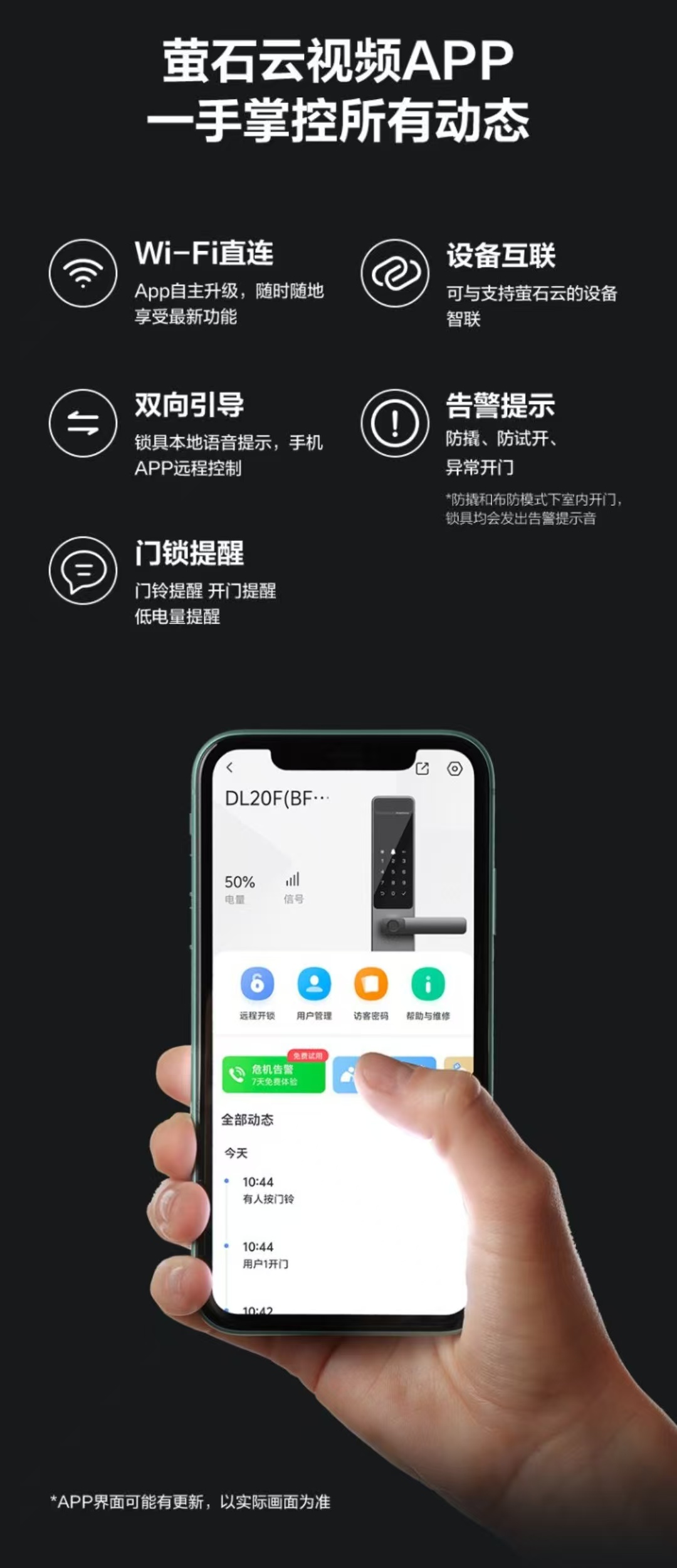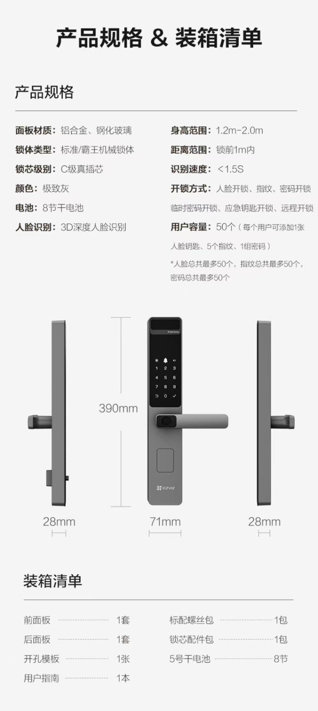 【石家庄】【萤石】DL20F智能锁;开锁方式:3D人脸识别;指纹;密码;机械钥匙;充电宝;APP远程;