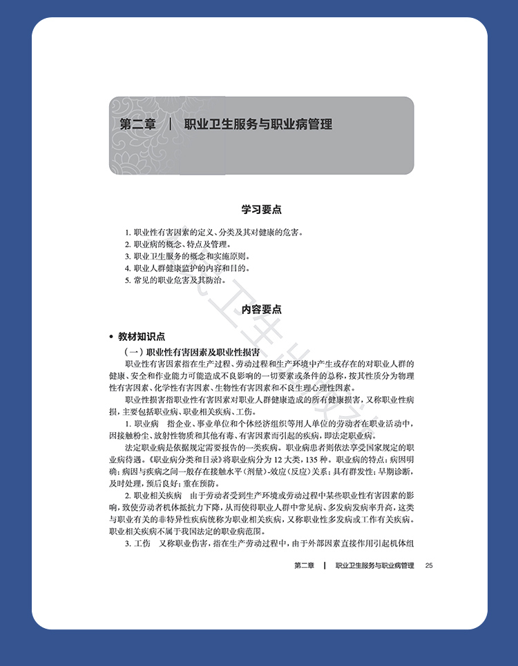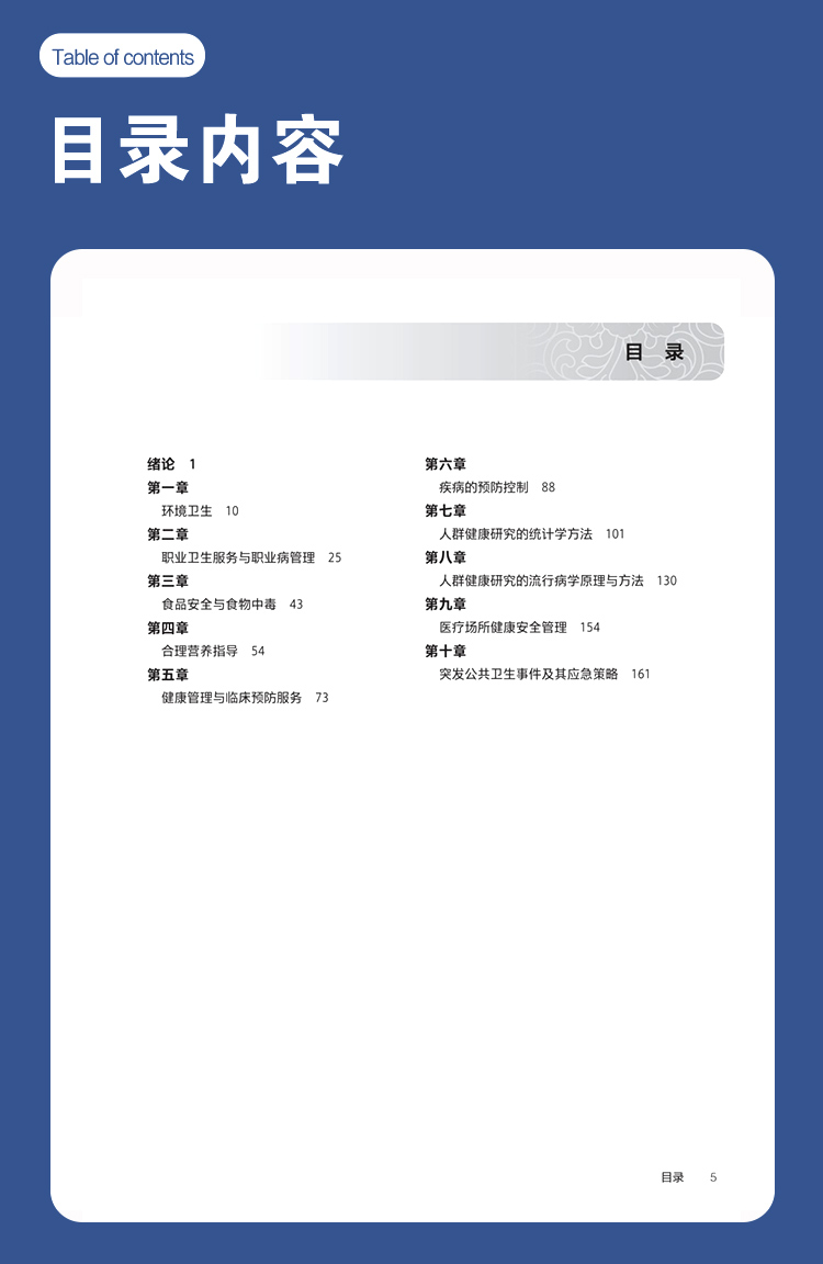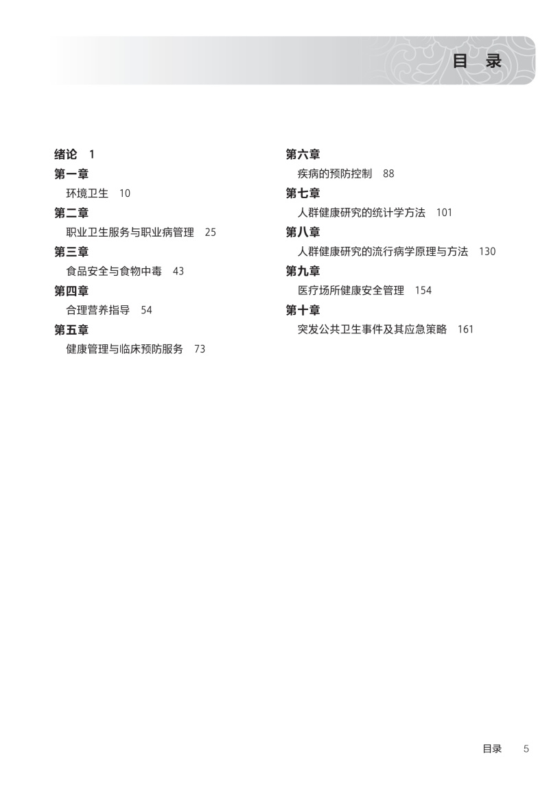 绪论 /1 第一章环境卫生 /10 第二章职业卫生服务与职业病管理/ 25 第三章食品安全与食物中毒/ 43 第四章合理营养指导/ 54 第五章健康管理与临床预防服务 /73 第六章疾病的预防控制/ 88 第七章人群健康研究的统计学方法 /101 第八章人群健康研究的流行病学原理与方法 /130 第九章医疗场所健康安全管理/ 154 第十章突发公共卫生事件及其应急策略 /161
