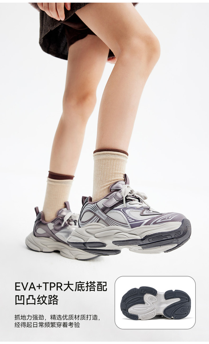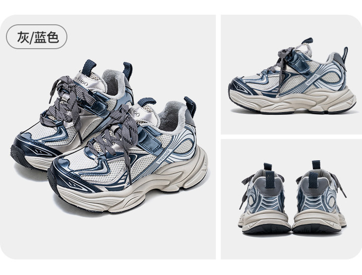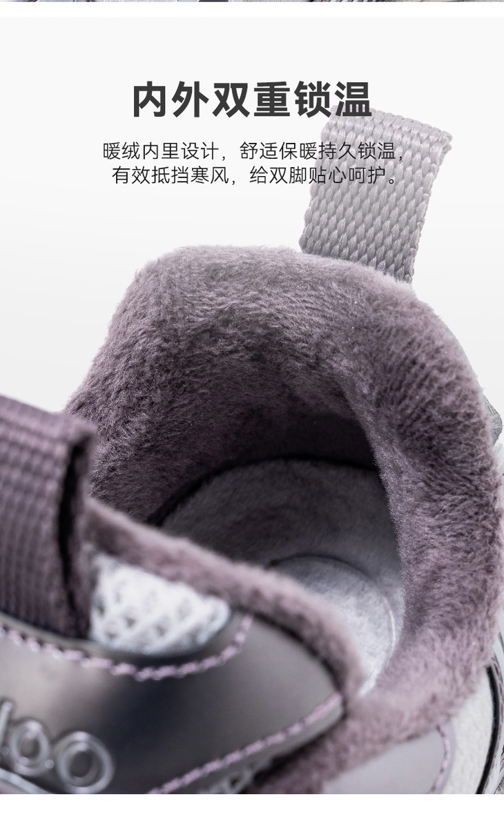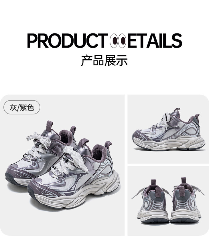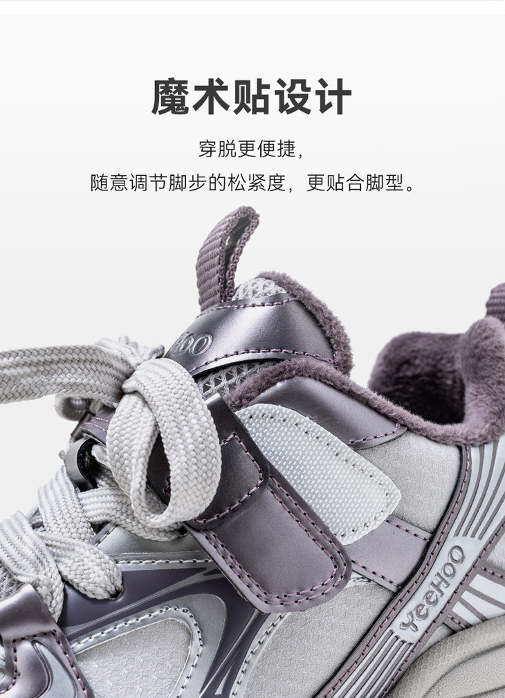 英氏YeeHo0童鞋冬季加绒潮酷运动鞋YHYLF2541803 货号:YHYLF2541803 颜色:灰蓝色、灰紫色、灰黑色 尺码:31-38 材质:鞋面 合成革;鞋底 EVA+TPR 鞋底采用高弹性 EVA 材质,弯曲自如,能让孩子走路没有束缚感,如同踩在云朵上一样舒服,非常适合孩子跑跳等活动。 鞋头进行加固处理,能防止孩子走路时踢到东西撞疼脚趾,为孩子的脚趾提供良好的保护。 为了稳定孩子的脚踝,防止走路时脚踝扭伤,英氏魔术贴运动鞋通常会对后跟进行加固处理 采用坚硬的材料或特殊的结构设计,为后跟提供有力的支撑,帮助孩子养成正确的走路姿势。