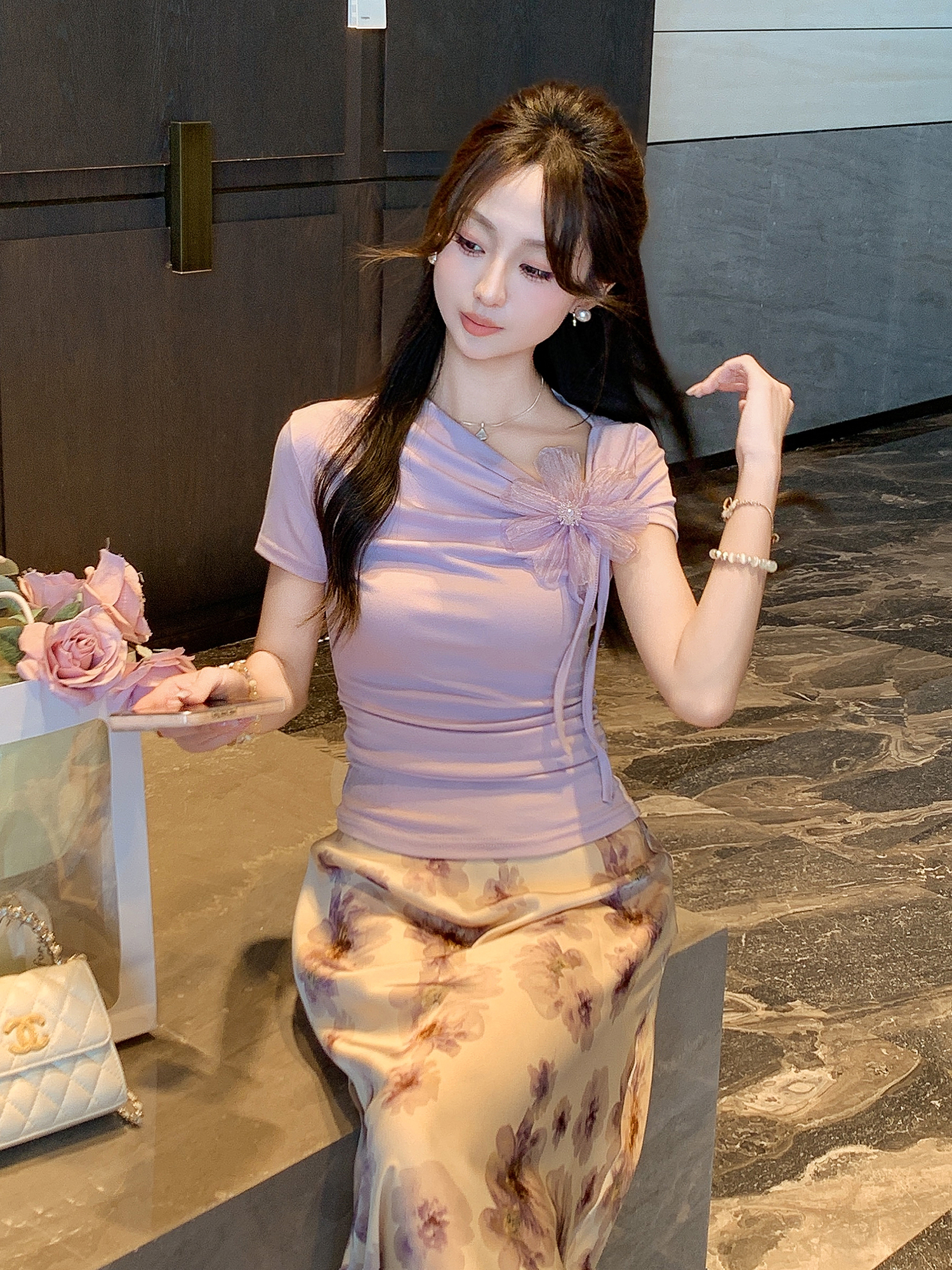 张心子【手工花】绝美独特立体花半高领针织衫短袖上衣 U2602045