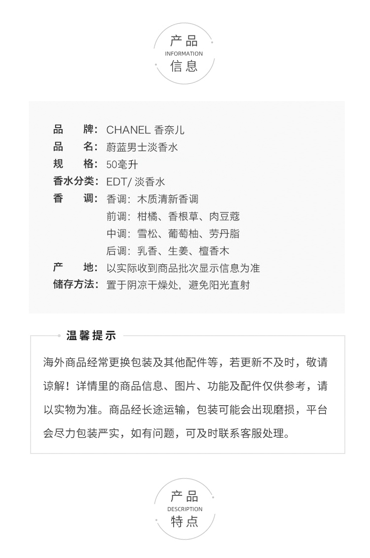 Chanel香奈儿蔚蓝男士淡香水50ml /100ml蔚蓝斩女香 送男友 送老公 礼物 送香水礼品袋【CDF】