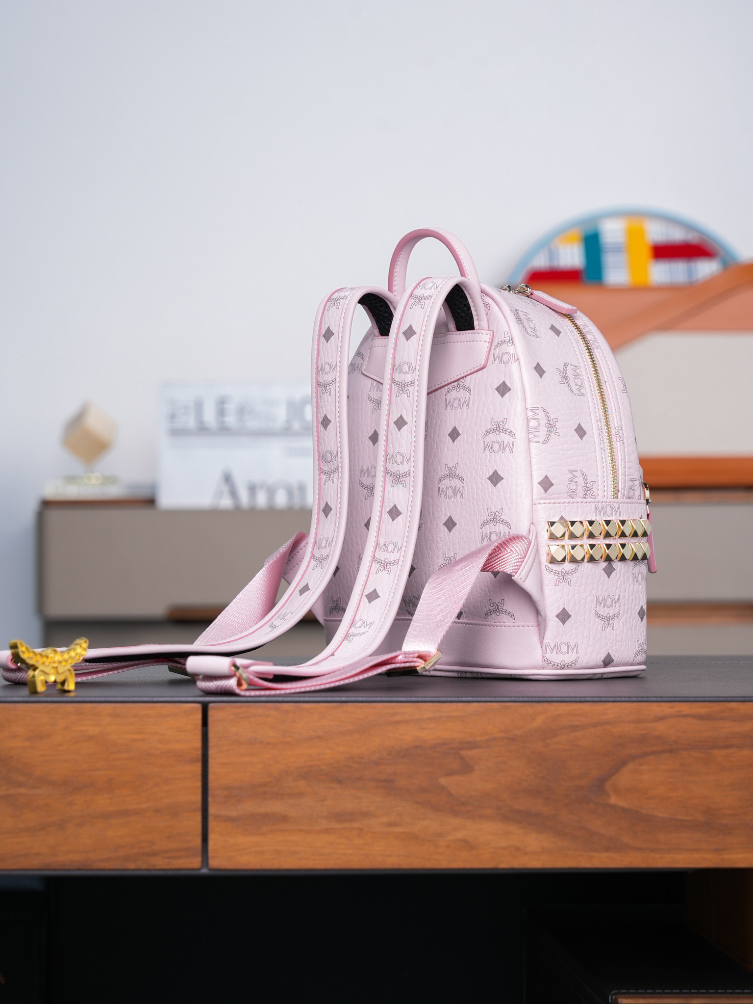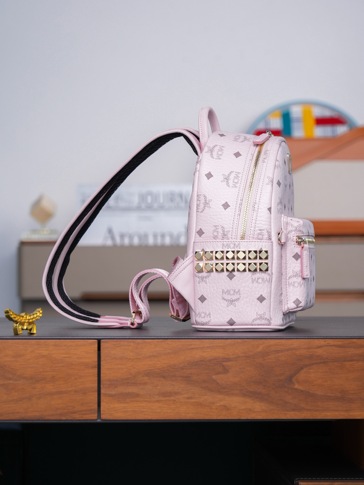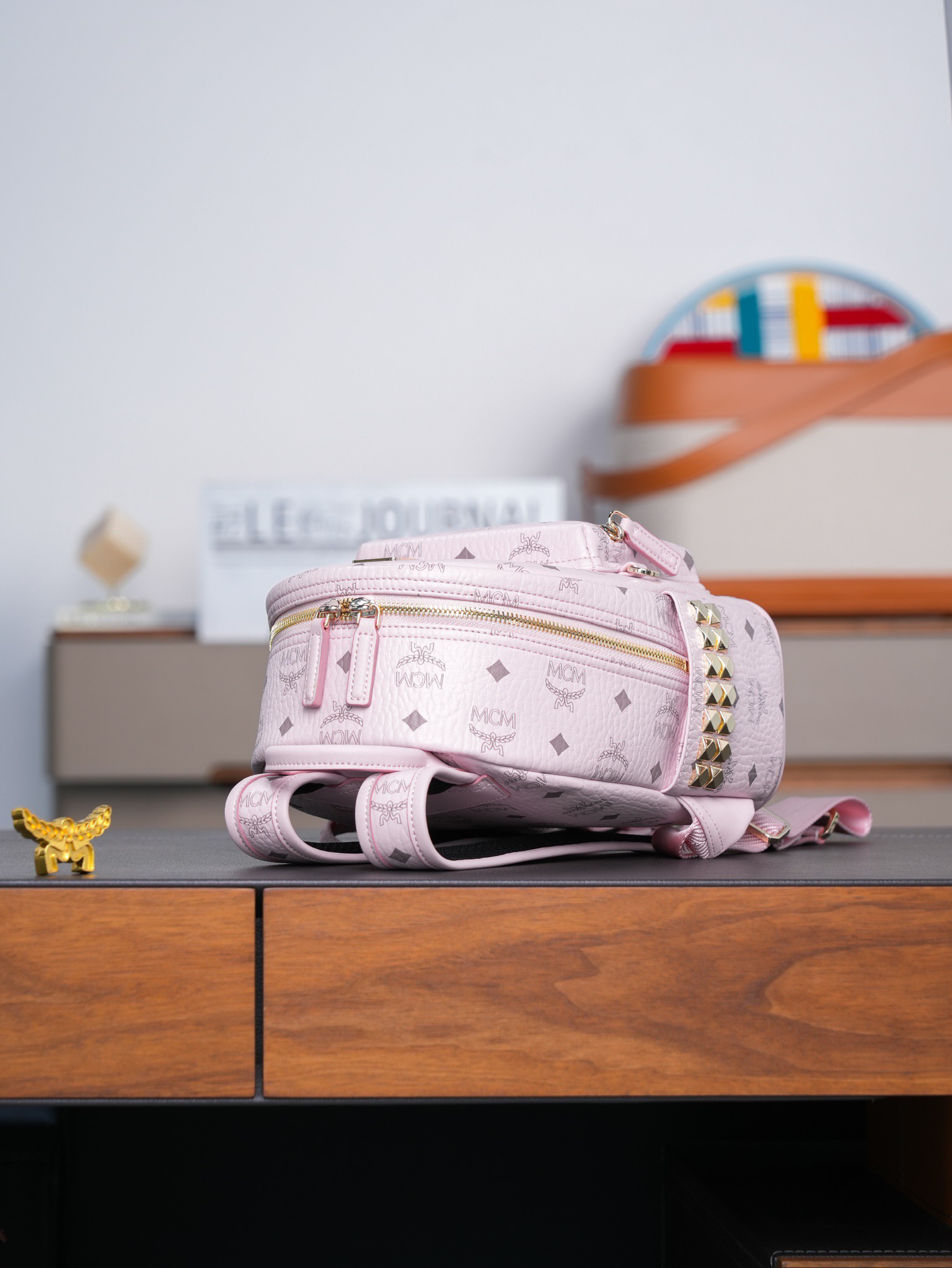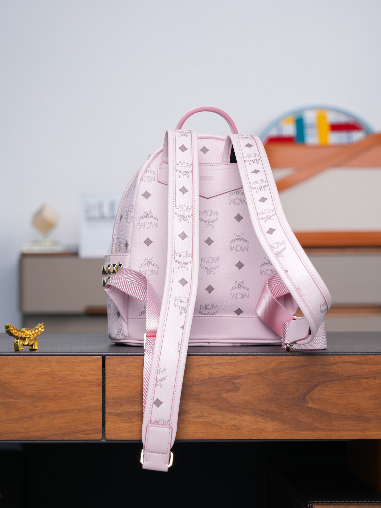 秋冬特惠💰850 原单MCM 原厂皮 轻雾粉迷你号 铆钉双肩背包MMK6SVE37CO001 轻雾粉色 这款Visetos经典