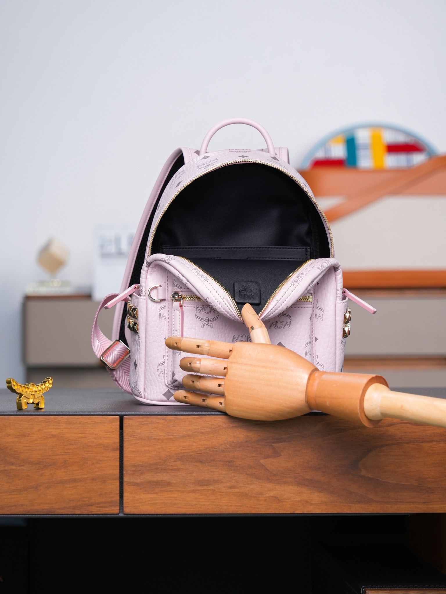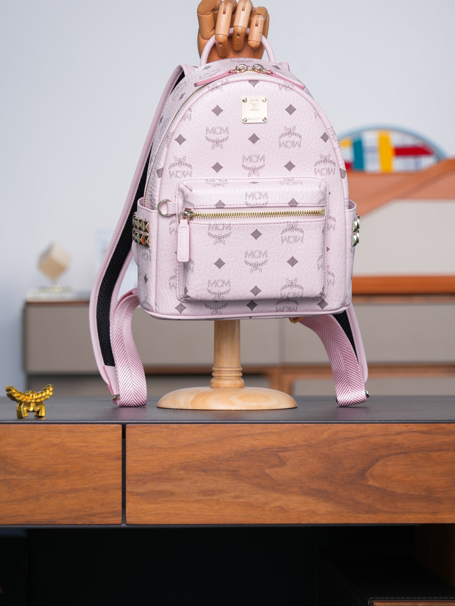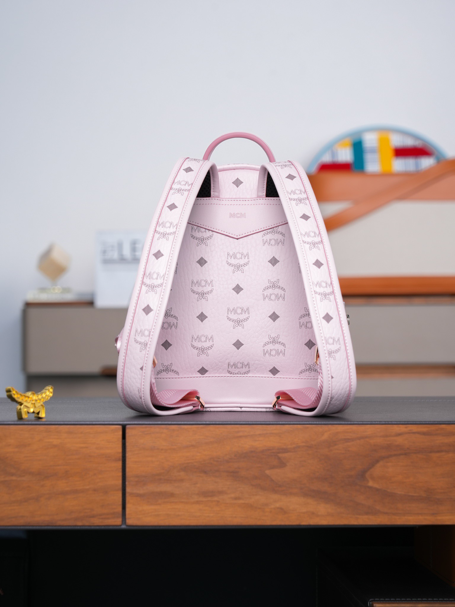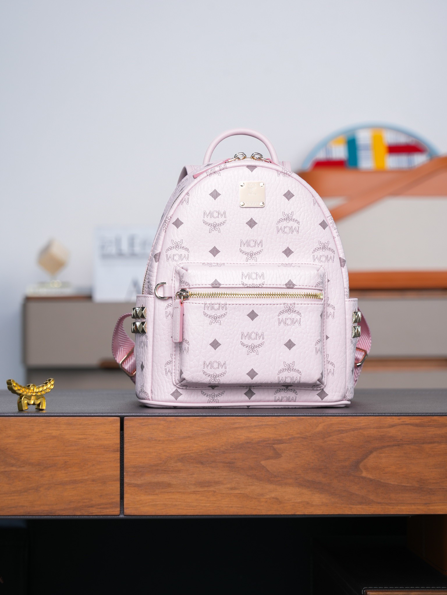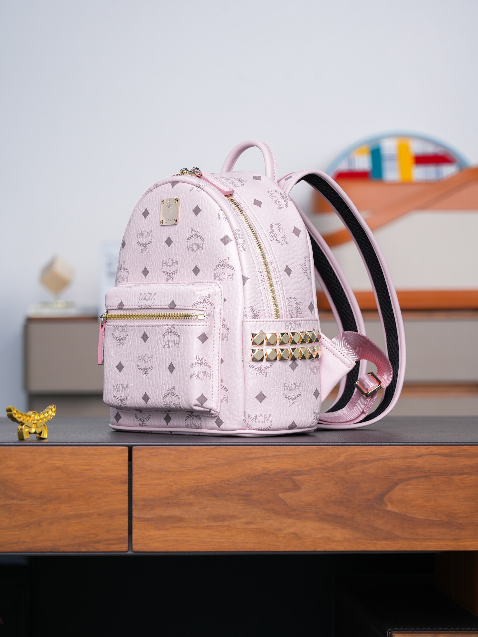秋冬特惠💰850 原单MCM 原厂皮 轻雾粉迷你号 铆钉双肩背包MMK6SVE37CO001 轻雾粉色 这款Visetos经典