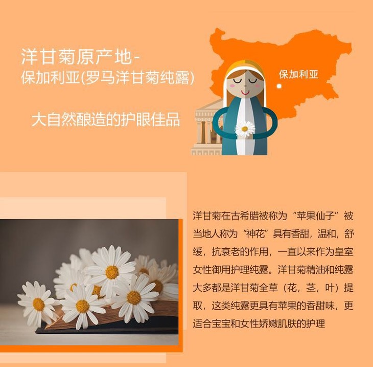 在欧洲,洋甘菊精油和纯露大多都是洋甘菊全草(花,茎,叶)提取,也有像法国鲜花小镇艾美丽莎只选用洋甘菊鲜花制作纯露,这类纯露更具有苹果的香甜味,更适合宝宝和女性娇嫩肌肤的护理。