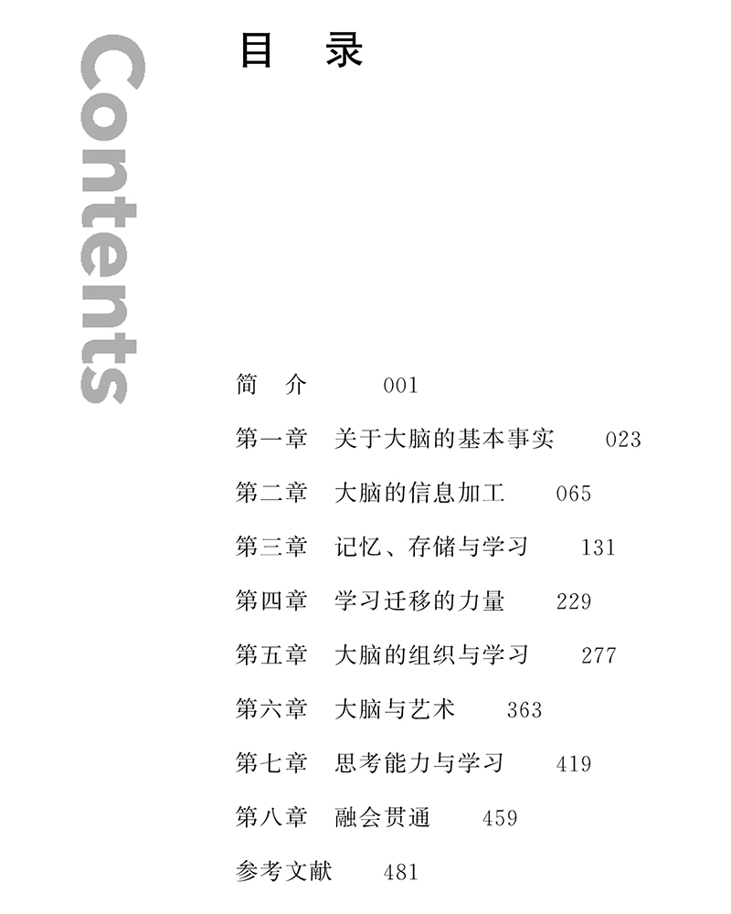 本书共分8章,对大脑的基本事实、信息加工模型、记忆系统、迁移能力、脑区分工、艺术的作用、思考与问题解决、教学设计与应用进行了详尽、深入的讨论。并在小框内标记出一些关键点,以便读者梳理和记忆。每章最后都设有“实践角”,提供补充性信息和教学策略实例。