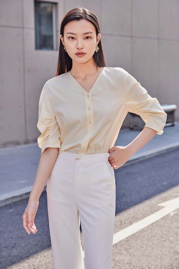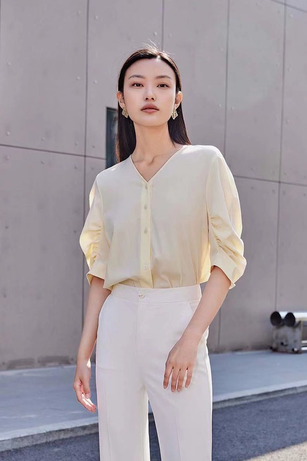 Le Malene 淡黄色气质简约短袖衬衫 18201