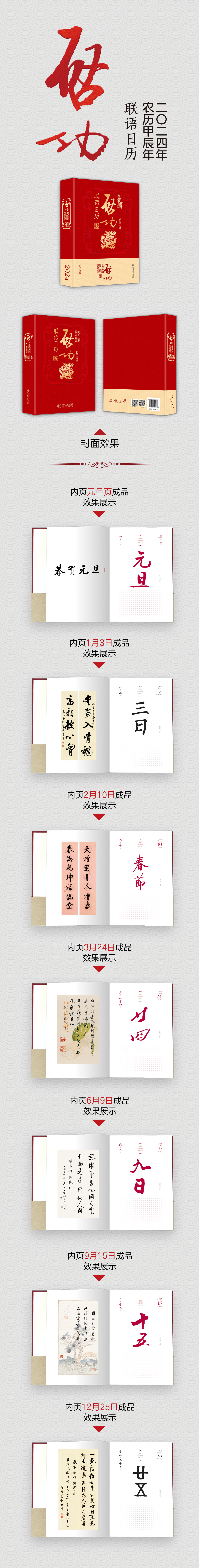 本书日期部分为历代著名书法家的书法作品集字,传统节日和二十四节气则采用启功先生的作品集字。