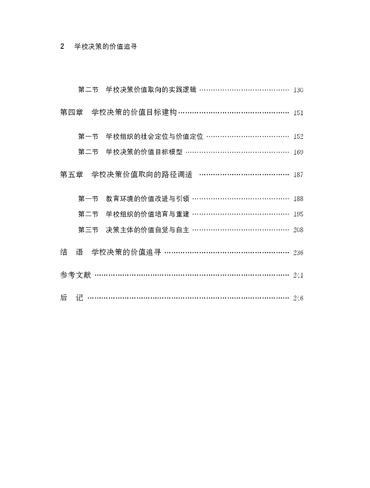 本书主要分为六个部分。导论“学校决策的价值之维”主要讨论从价值维度研究学校决策的缘由、意义和方法。第一章“学校决策的价值困境”主要研究学校决策中面临的价值难题、价值冲突和价值困境,并探寻其背后的因素与结构。第二章“学校决策的三种价值取向分析”主要研究学校决策实践中最主要的价值取向问题。第三章“学校决策价值取向的逻辑”,主要研究学校决策价值取向背后的理论逻辑与实践逻辑。第四章“学校决策的价值目标建构”主要研究学校决策价值取向的理想模型,为学校决策提供价值指引。第五章“学校决策价值取向的路径调适”主要为学校决策提出具体的可操作性的路径建议。