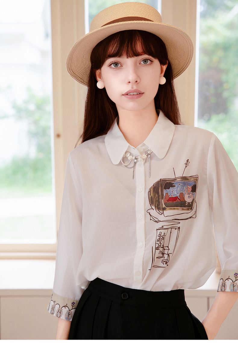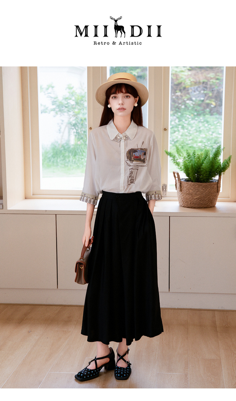 谜底白衬衫七分袖女士2025夏季新款通勤风绣花合体衬衣257MC7845