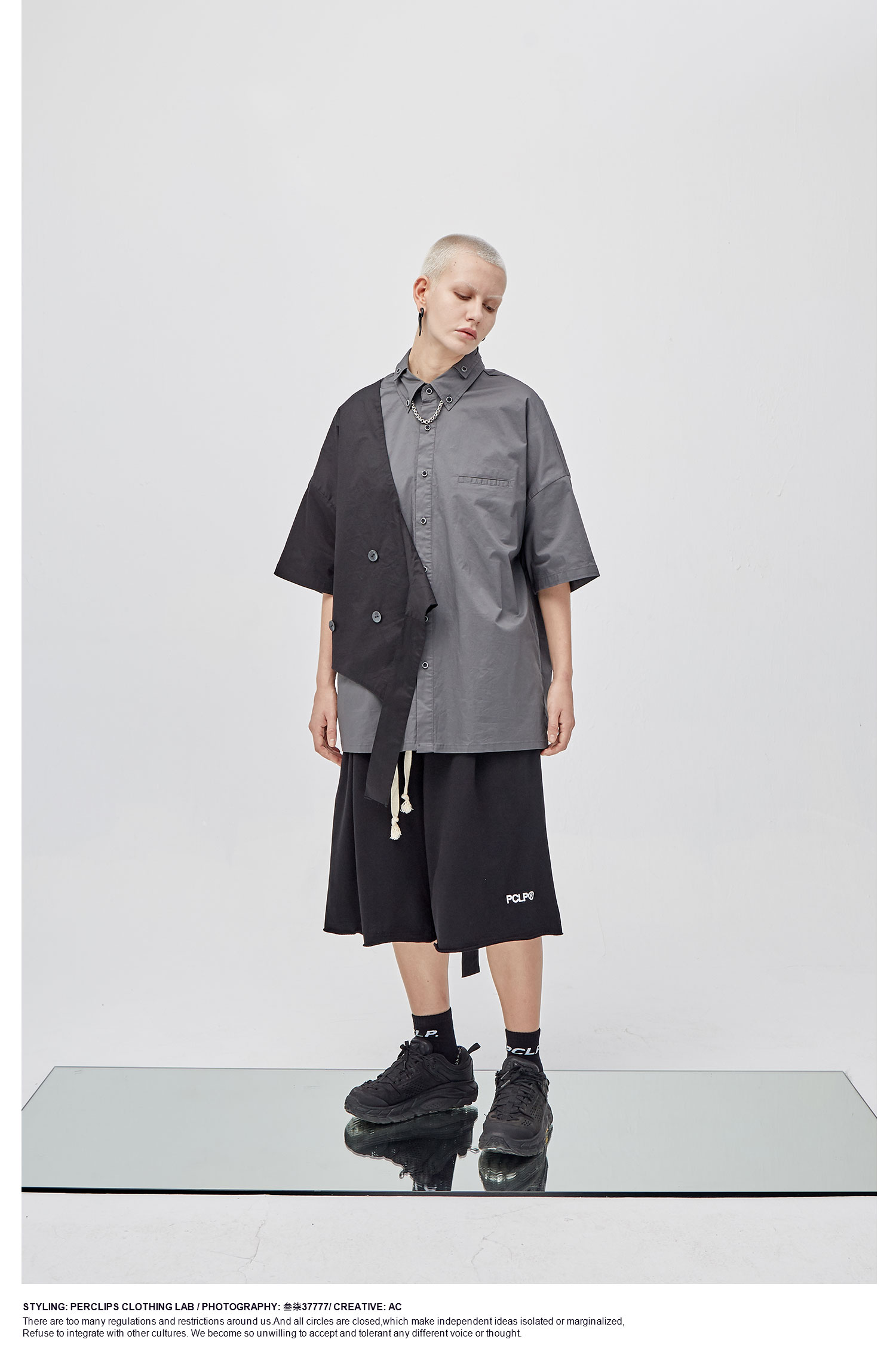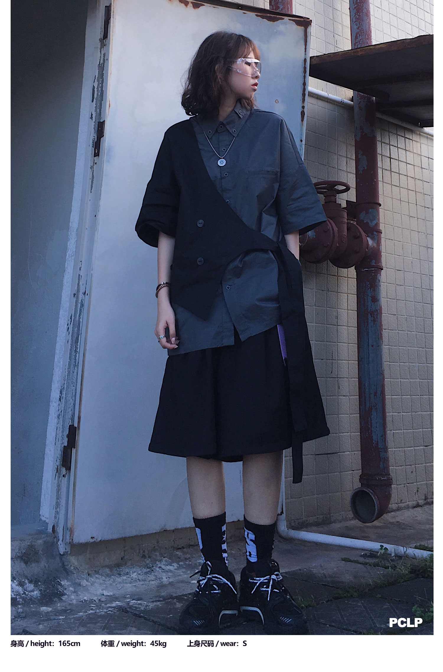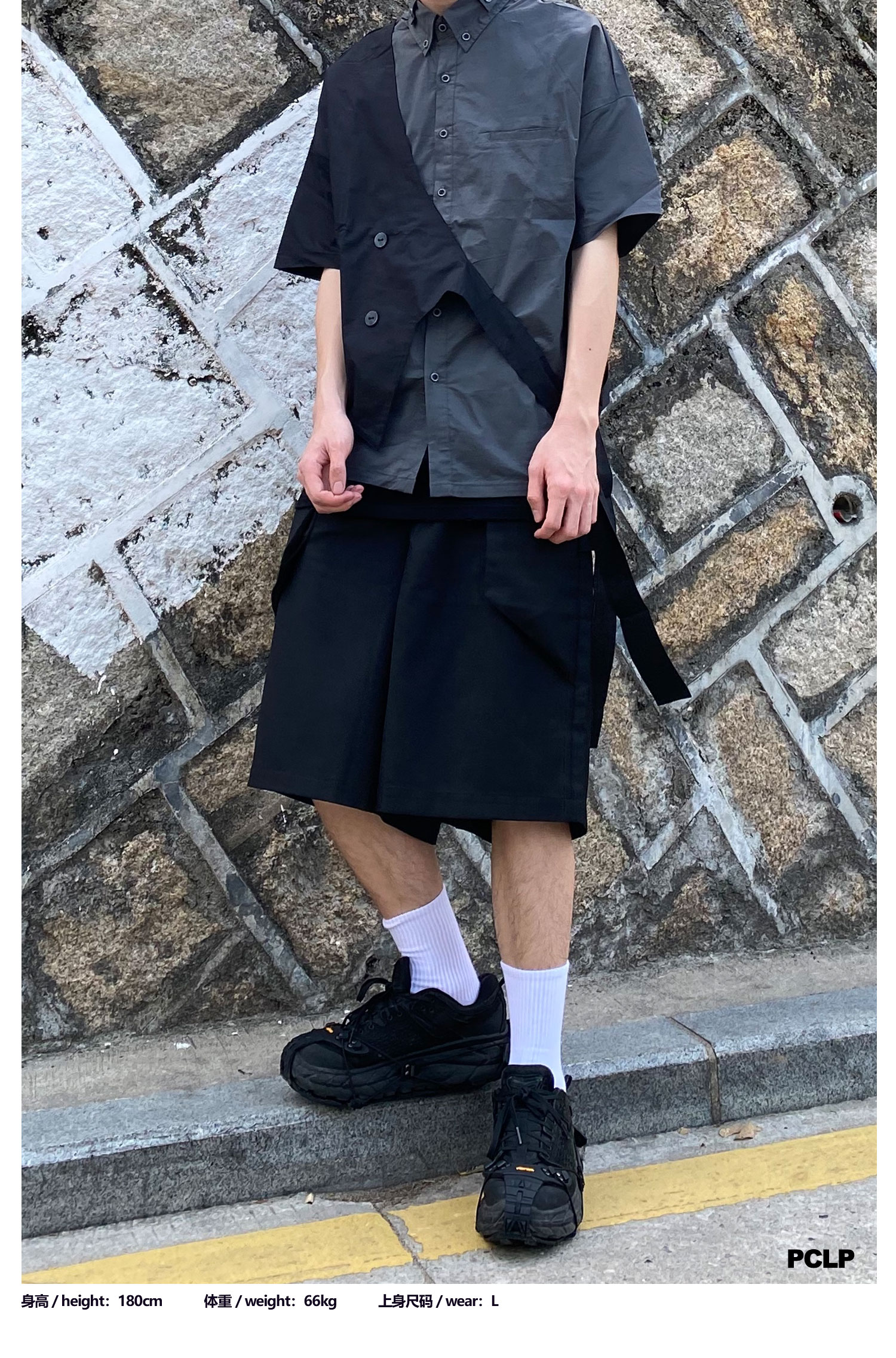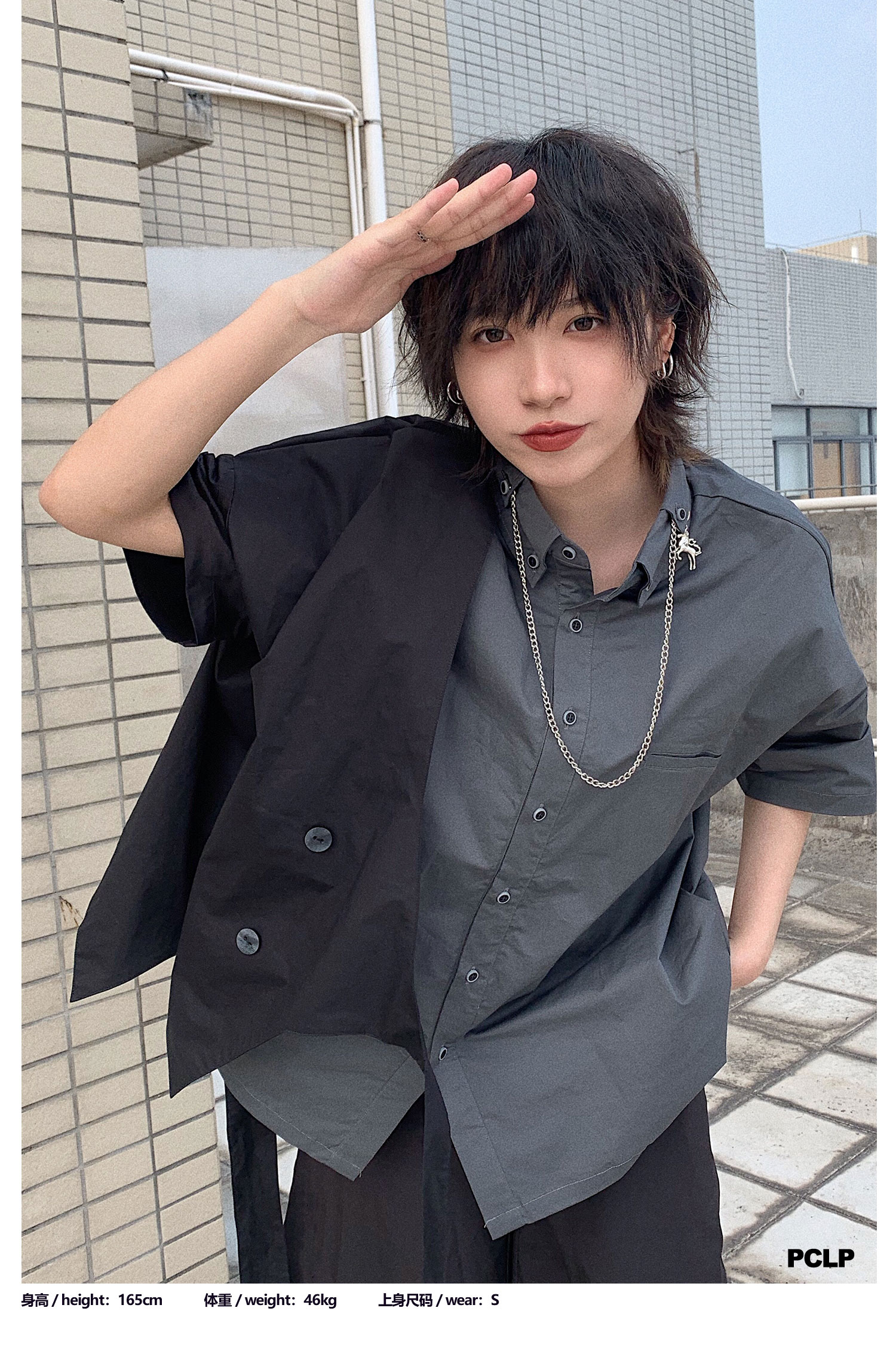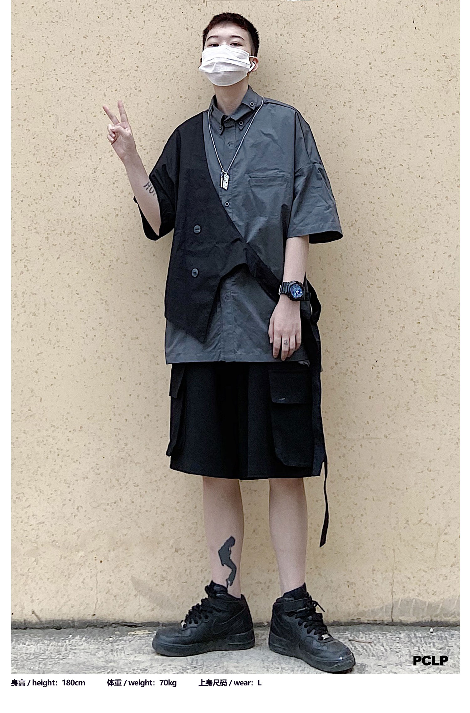 PCLP(PERCLIPS)假两件短袖衬衫国潮牌夏季工装日系港风半袖衬衣男