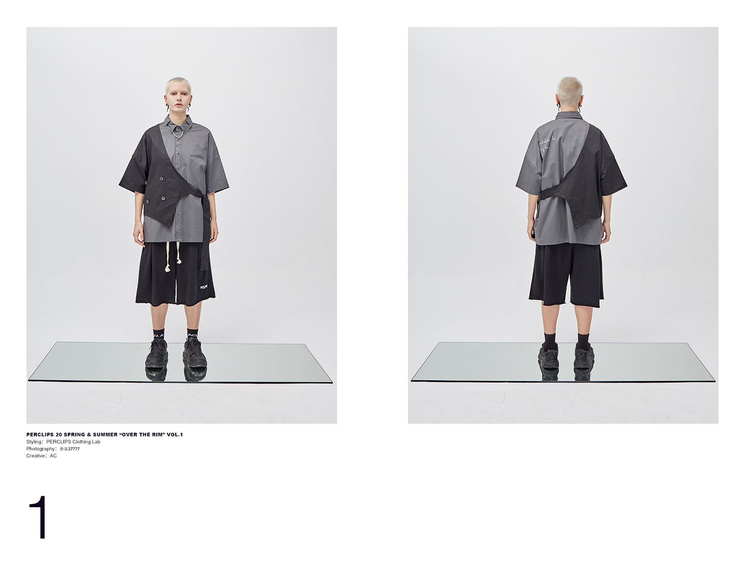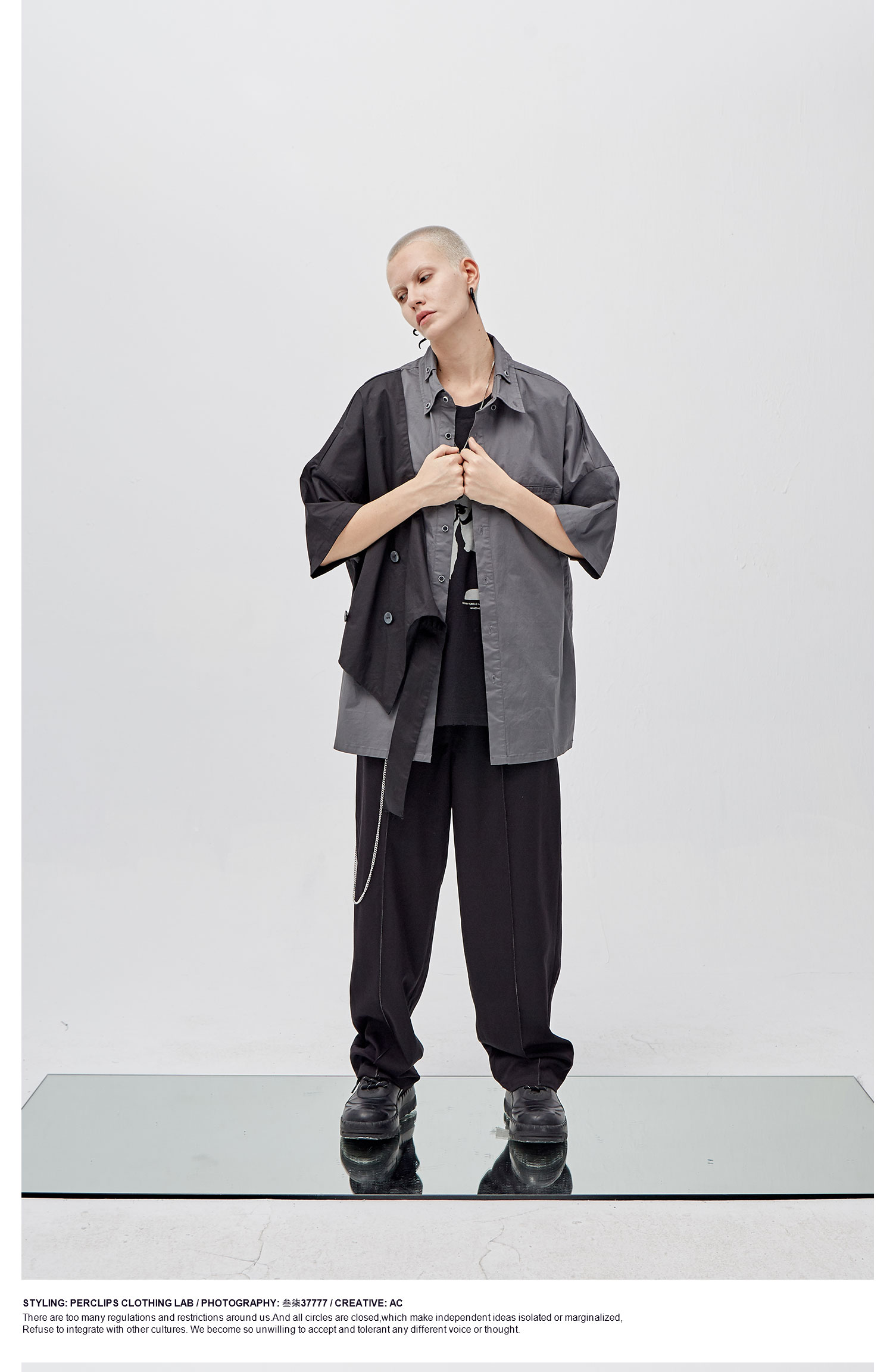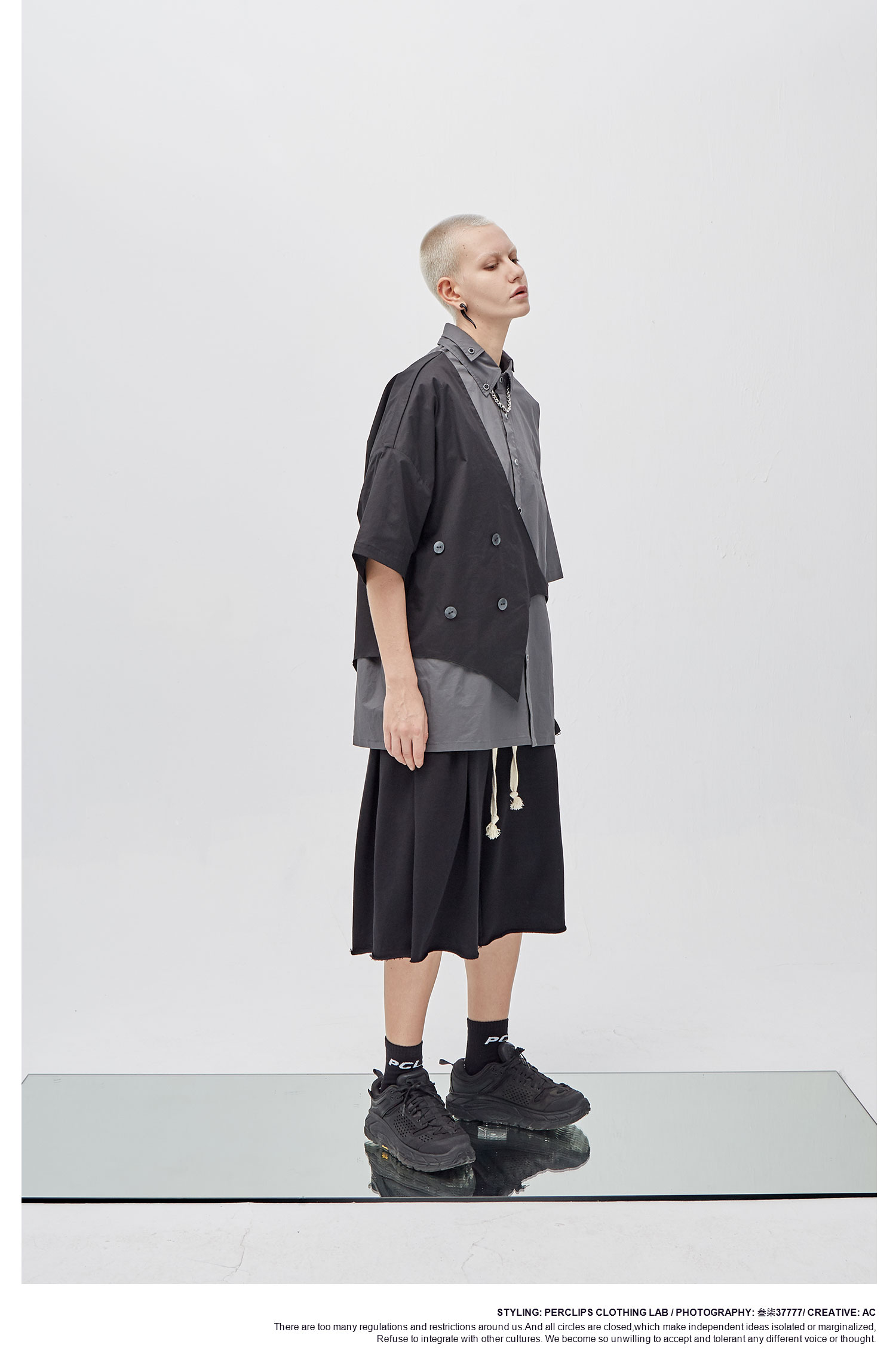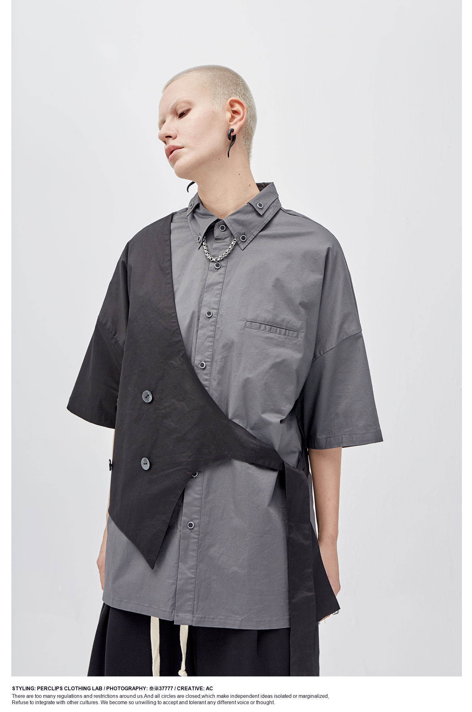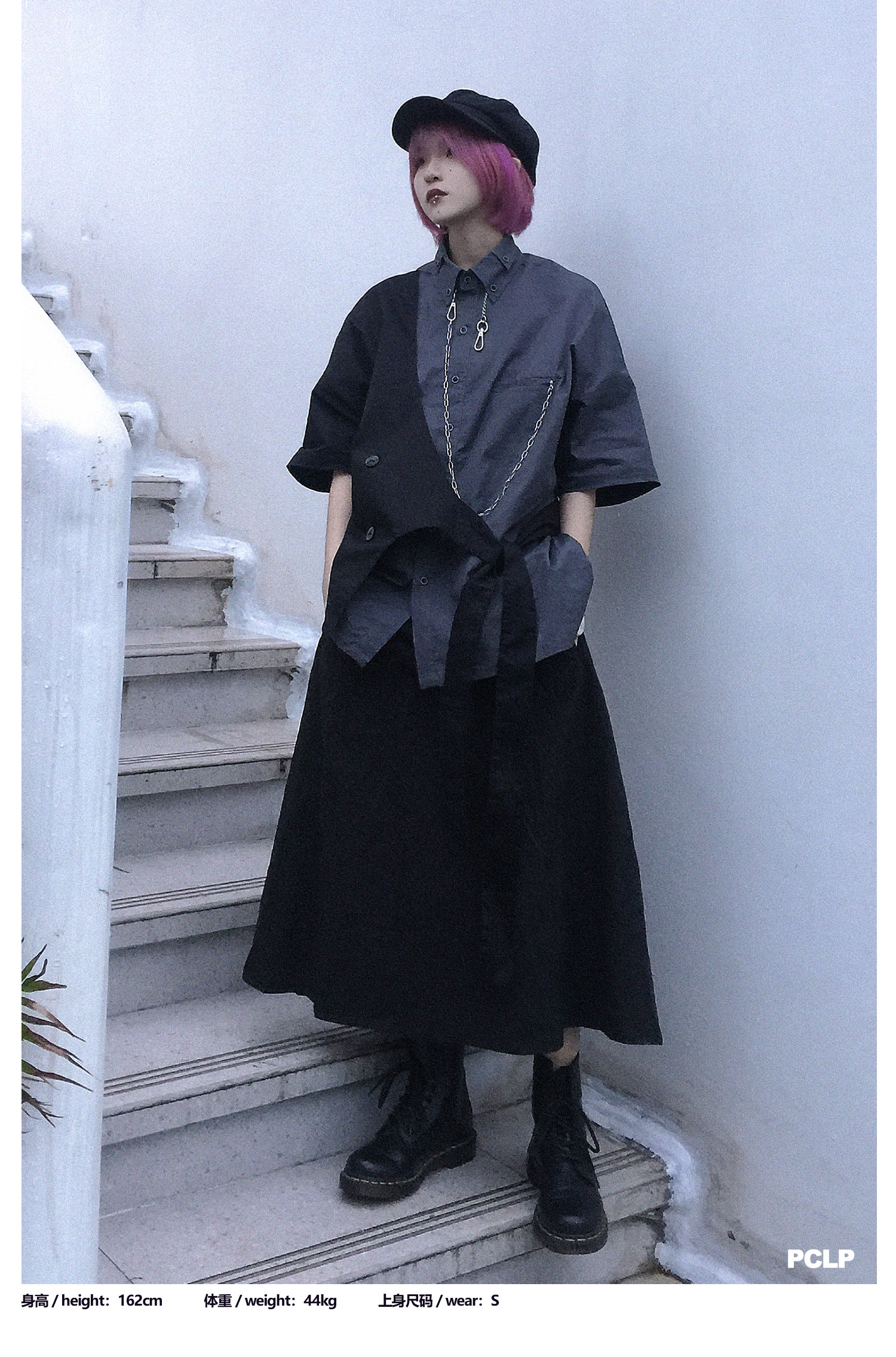 PCLP(PERCLIPS)假两件短袖衬衫国潮牌夏季工装日系港风半袖衬衣男