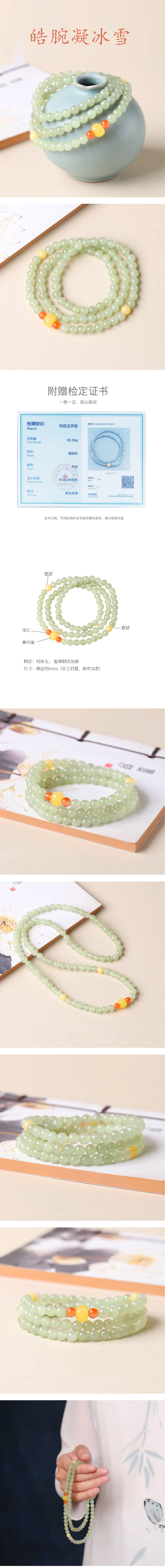 皓腕凝冰雪天然和田玉多圈手串6mm 南红玛瑙手链天然蜜蜡带证书