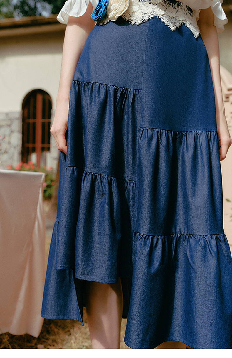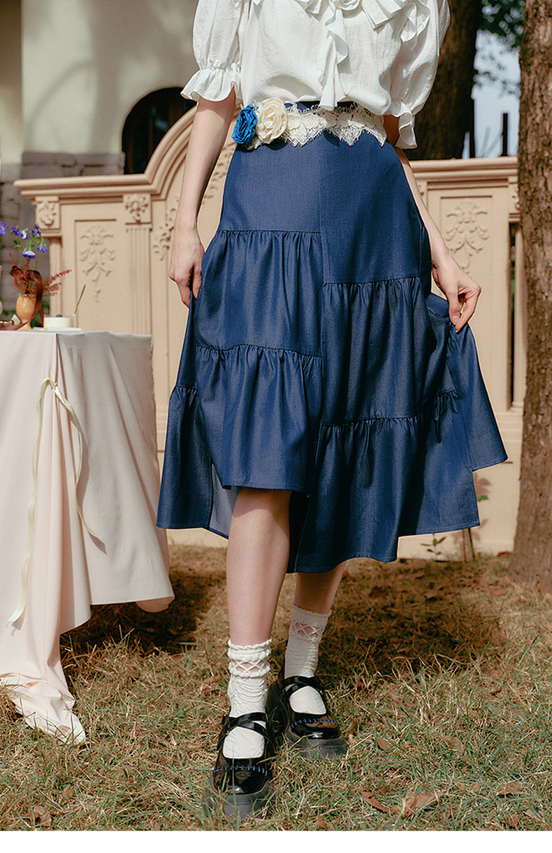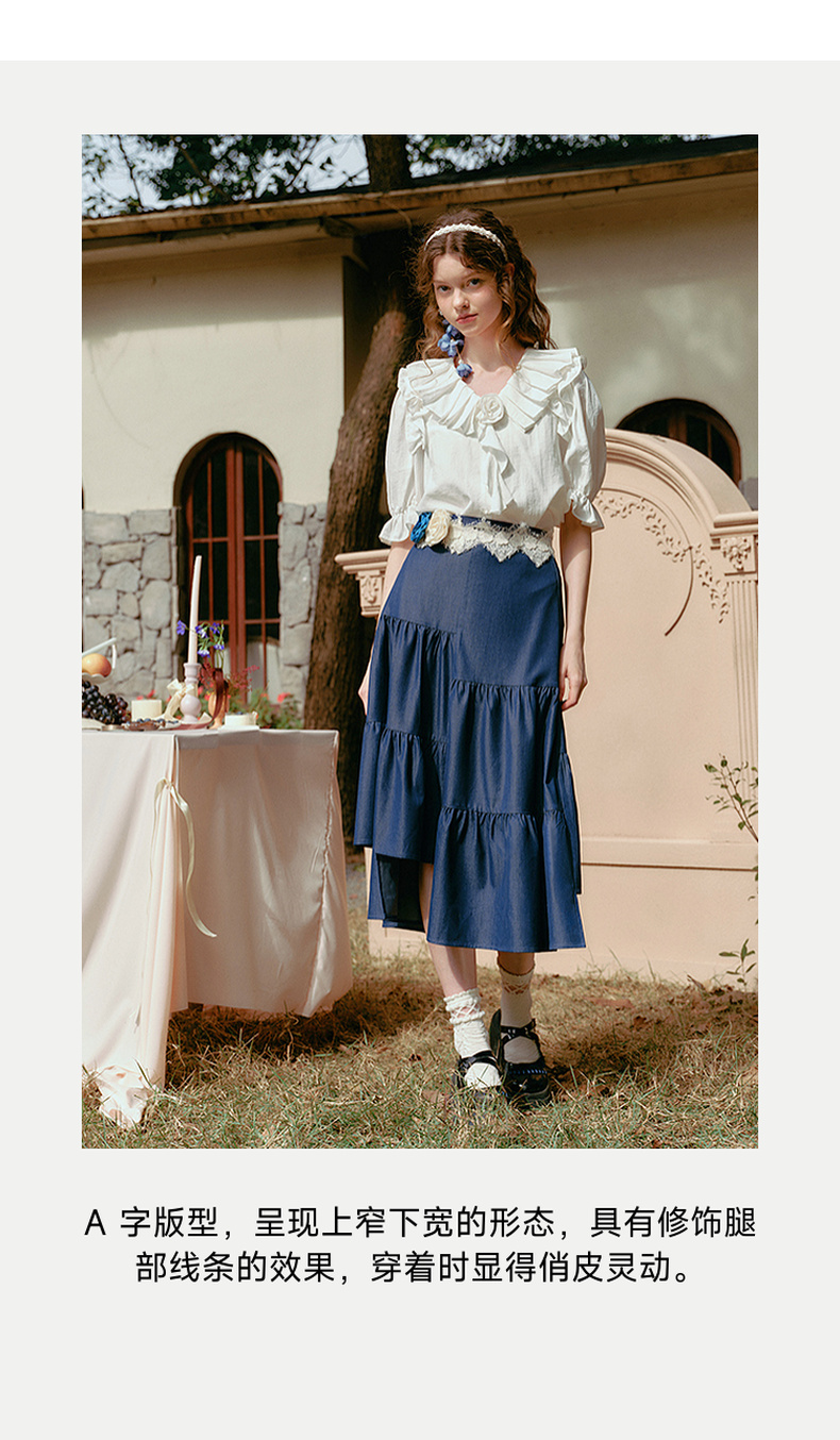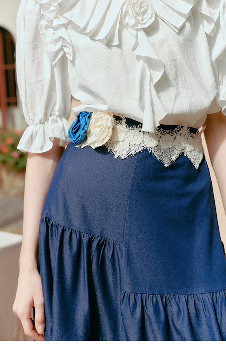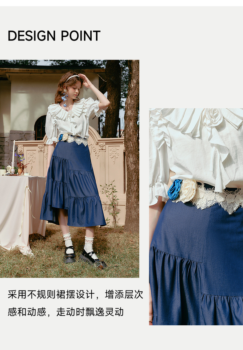 两三事 夏夜晚风 2025春季新款不规则荷叶边裙摆花朵腰带半身裙