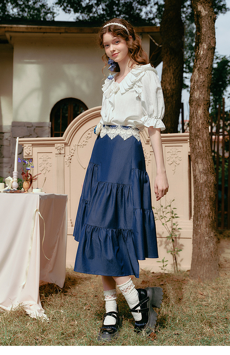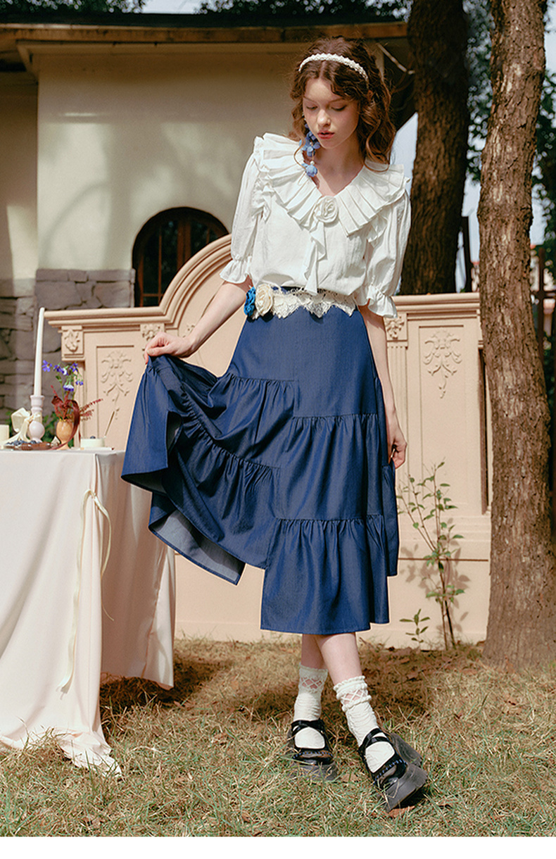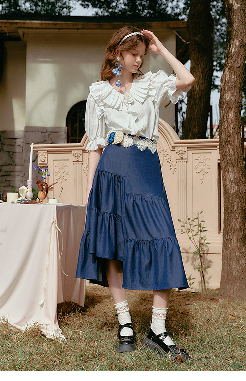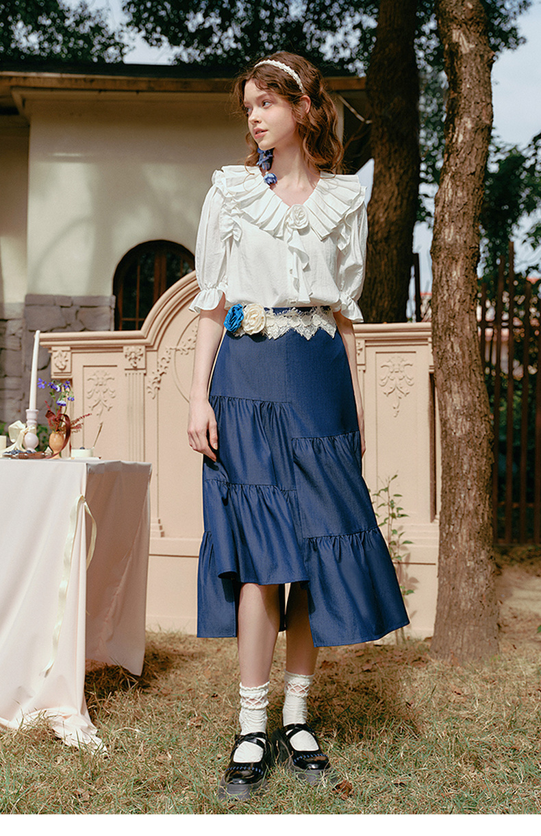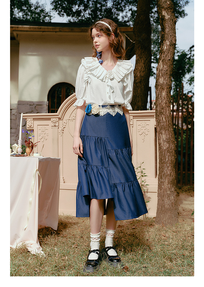 两三事 夏夜晚风 2025春季新款不规则荷叶边裙摆花朵腰带半身裙