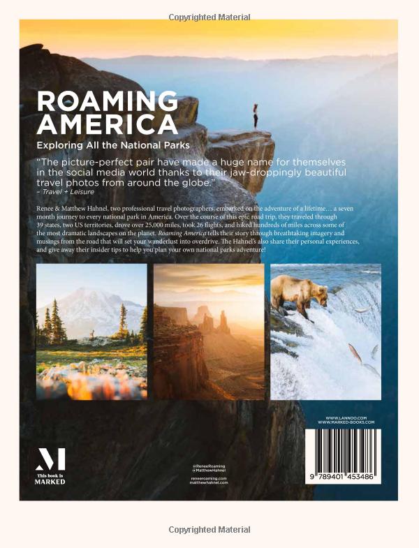Renee & Matthew Hahnel, two professional travel photographers, embarked on the adventure of a lifetime... a seven-month journey to every national park in the USA. Over the course of this epic road trip, they traveled through 39 states, two US territories, drove over 25,000 miles, took 26 flights, and hiked hundreds of miles across some of the most dramatic landscapes on the planet. Roaming America tells their story through breathtaking imagery and musings from the road that will set your wanderlust into overdrive. The Hahnels also share their personal experiences, and give away their insider tips to help you plan your own national parks adventure!
