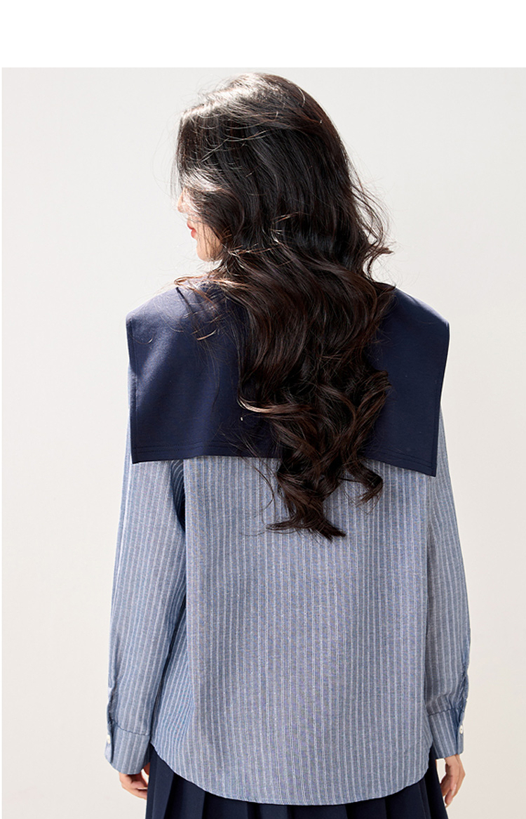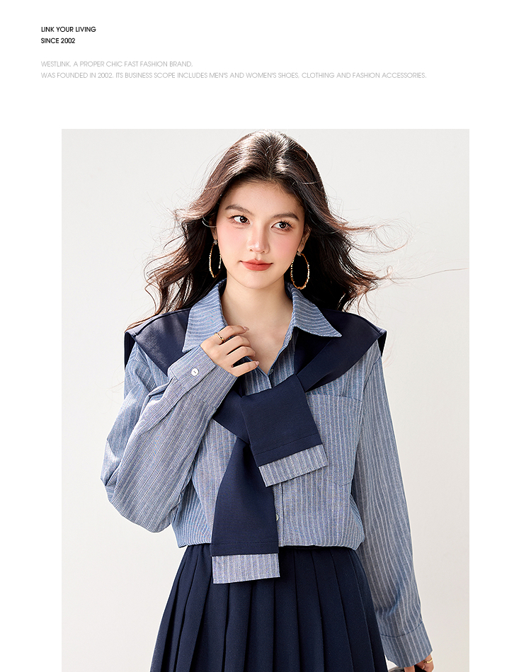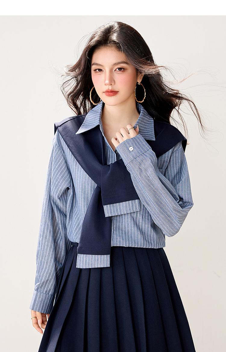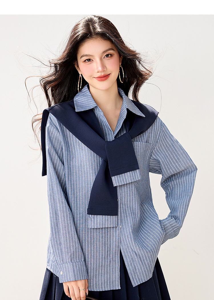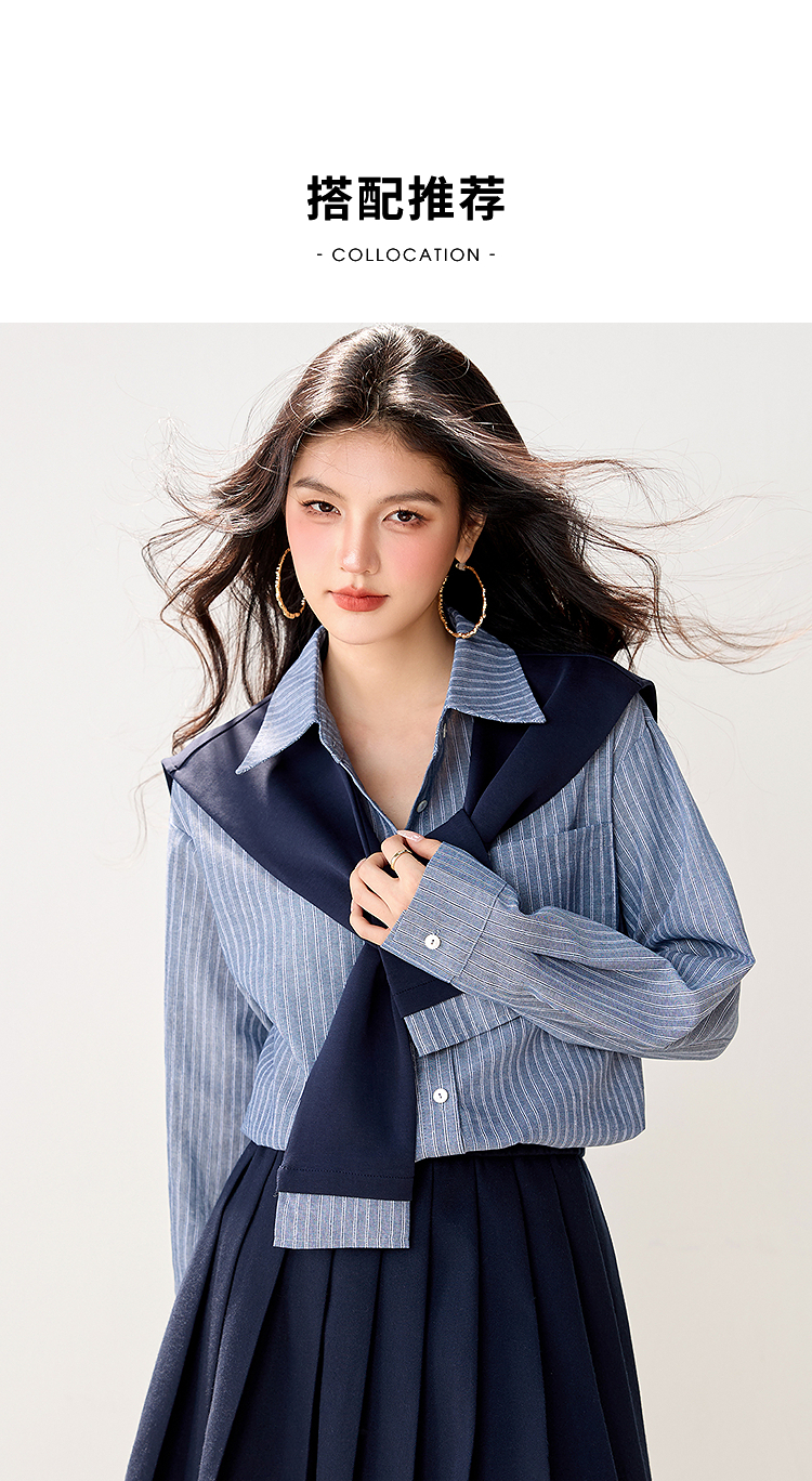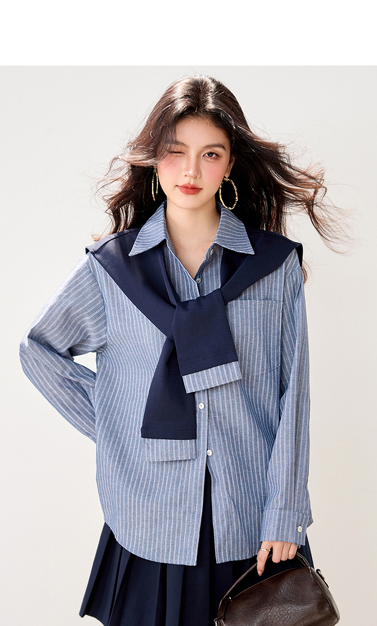 西遇韩系蓝色条纹衬衫女2026春季新款学院风宽松衬衣配披肩两件套SS060158