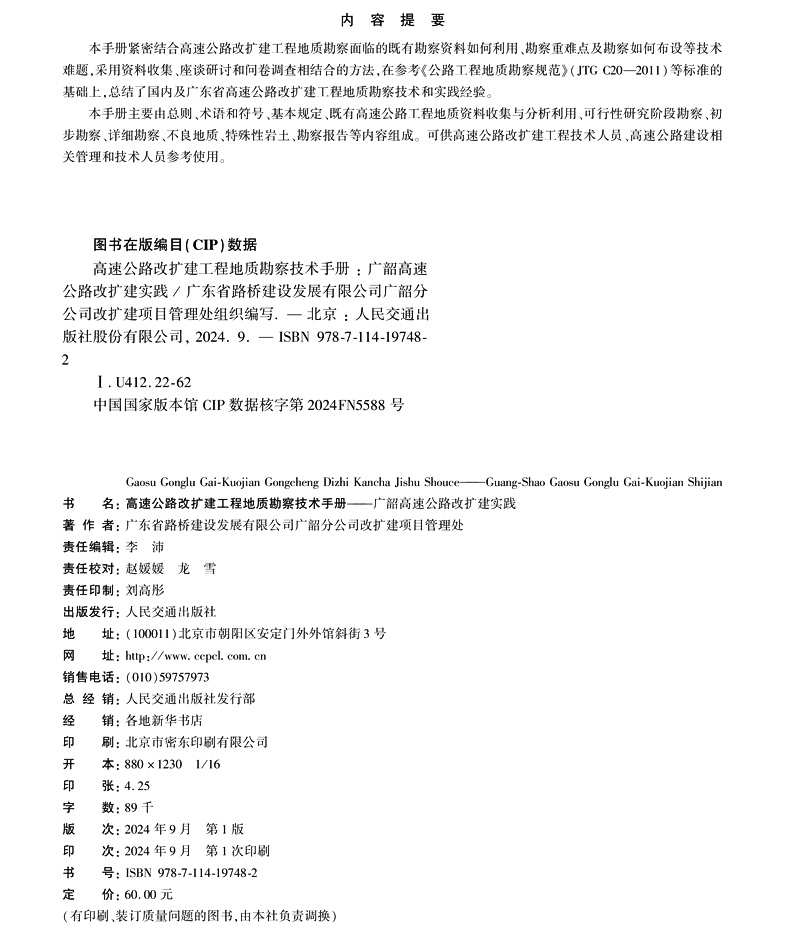 书名:高速公路改扩建工程地质勘察技术手册——广韶高速公路改扩建实践