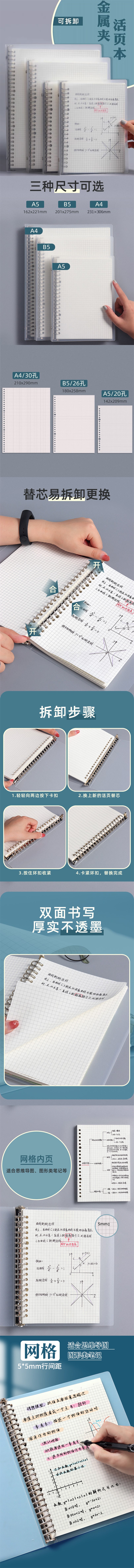 小方格活页笔记本 简约网格金属磨砂PP面1本A4/30孔B6/26孔A5/20孔替换本芯