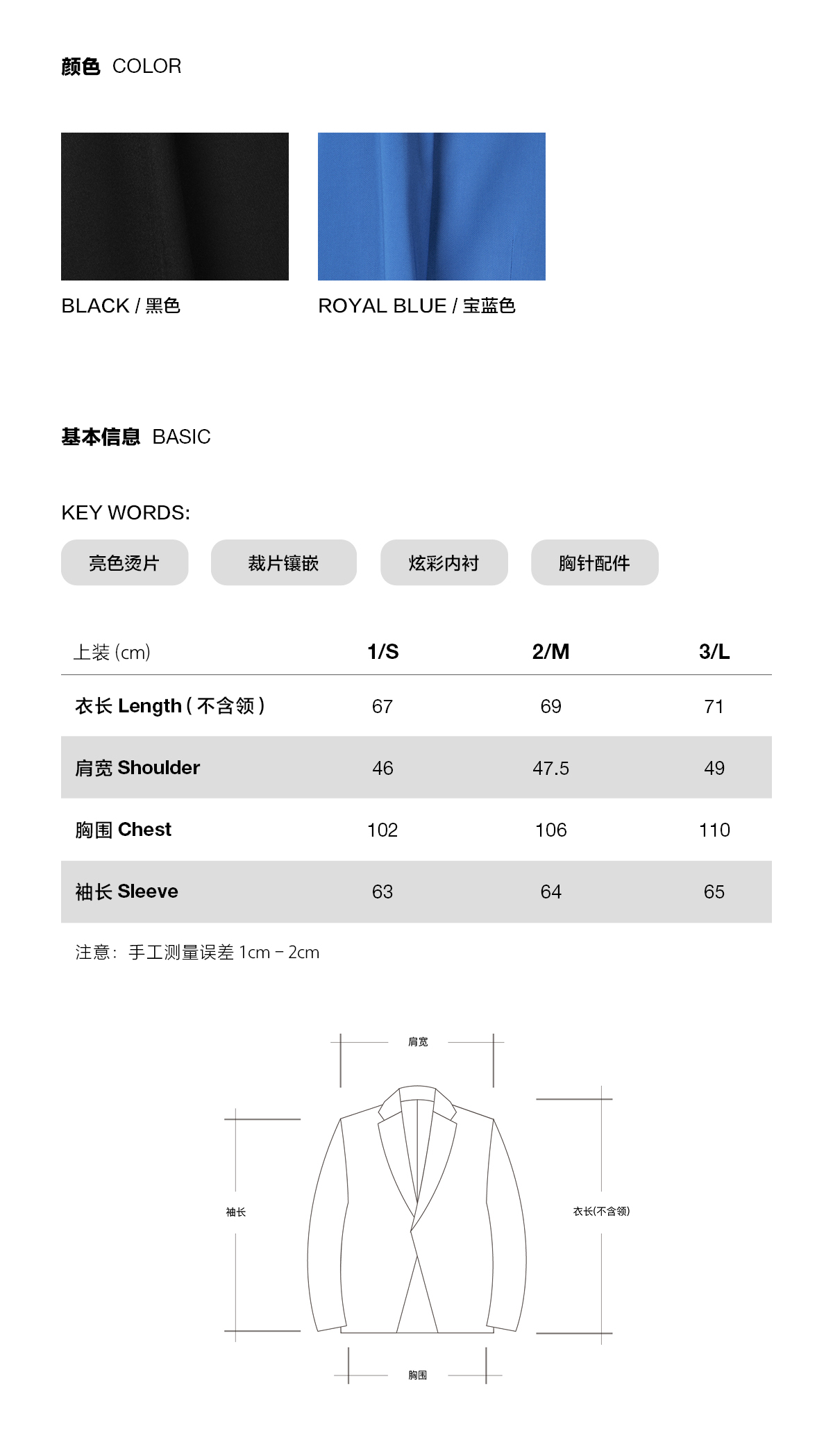| 图案: 纯色 | 衣门襟: 一粒单排扣 |