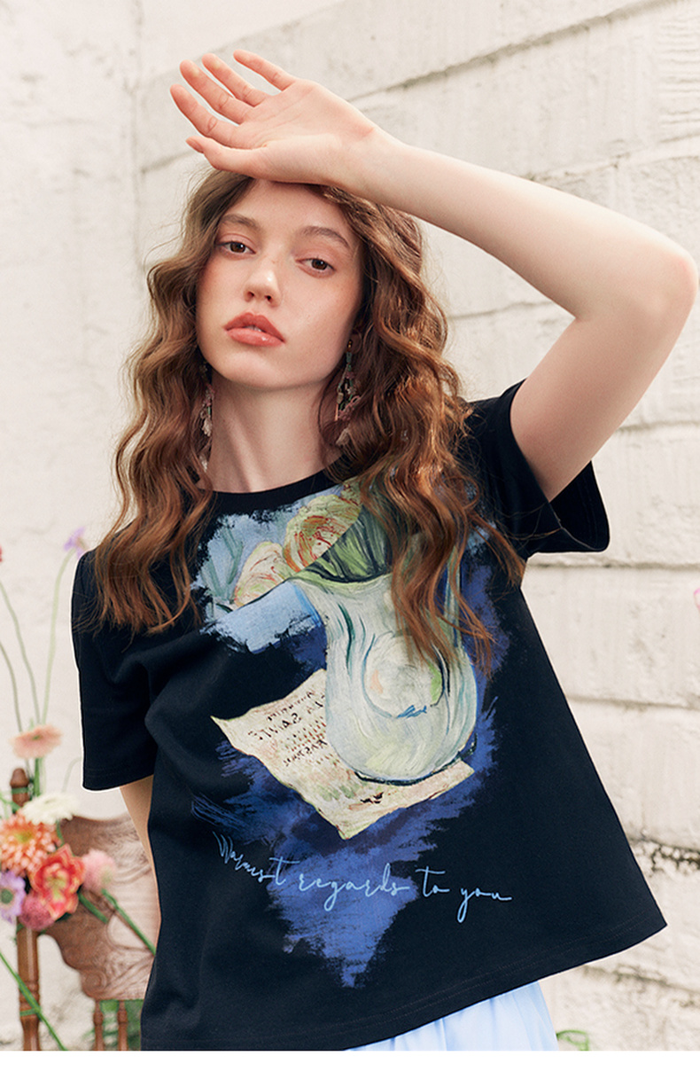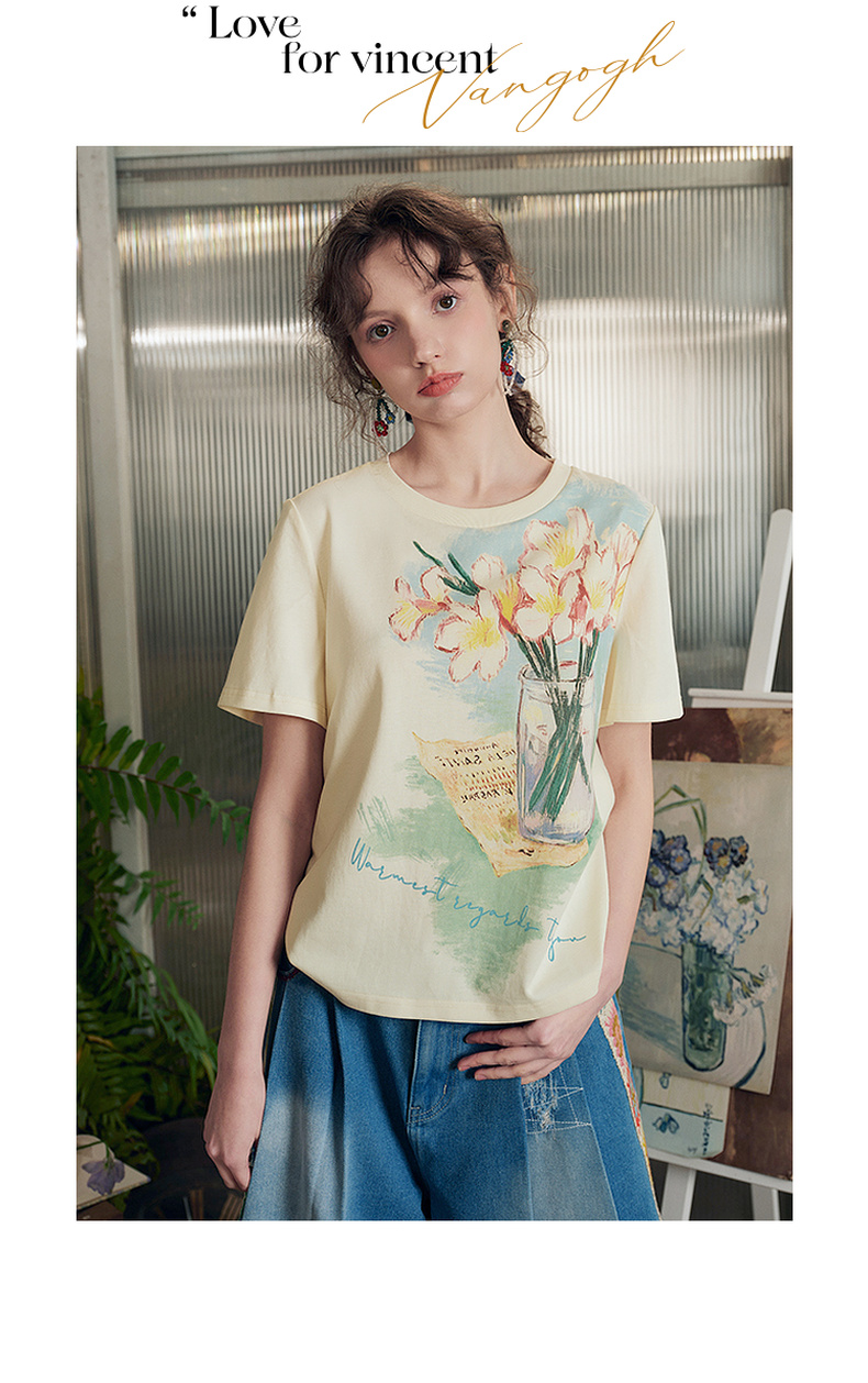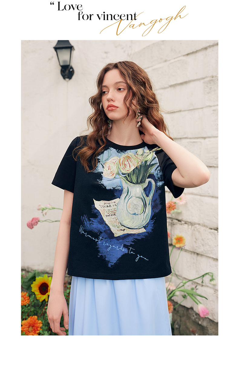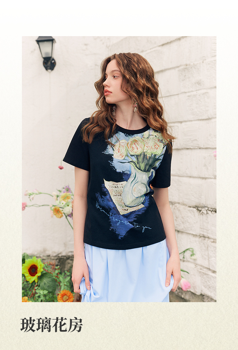 两三事梵高文艺玻璃花房2025夏新款文艺风油画印花短袖t恤女