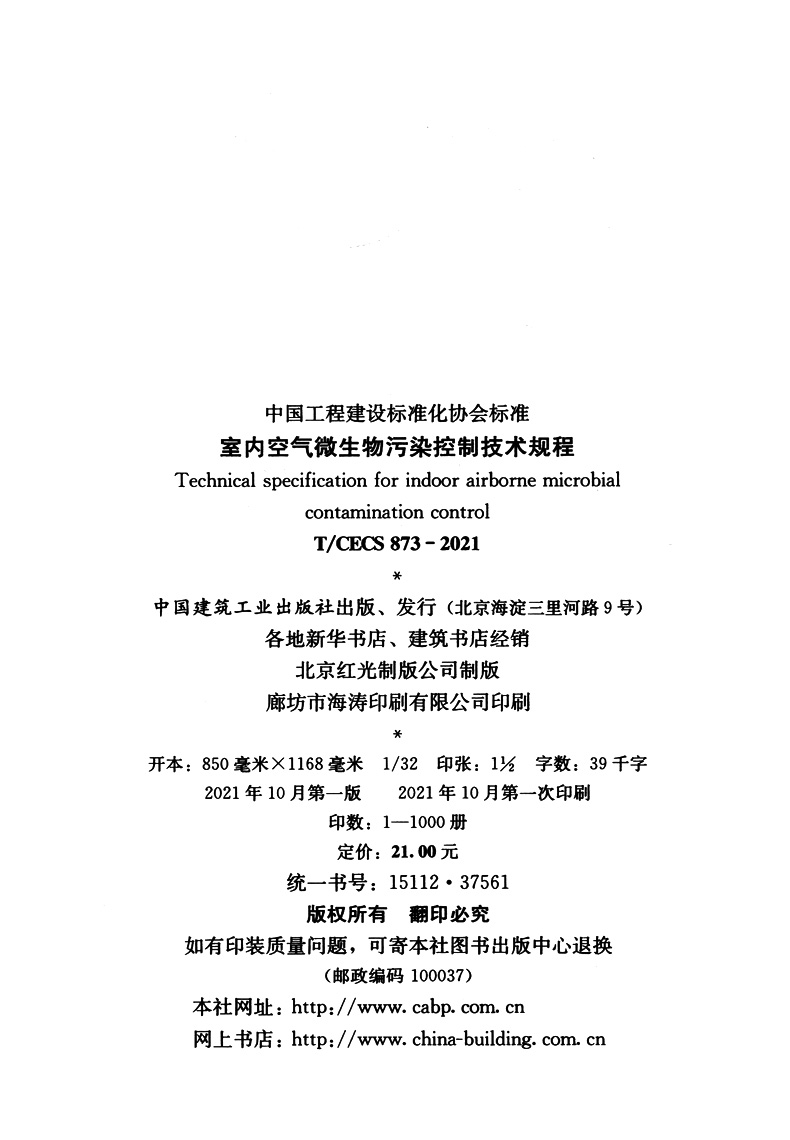 书名:T/CECS873-2021室内空气微生物污染控制技术规程