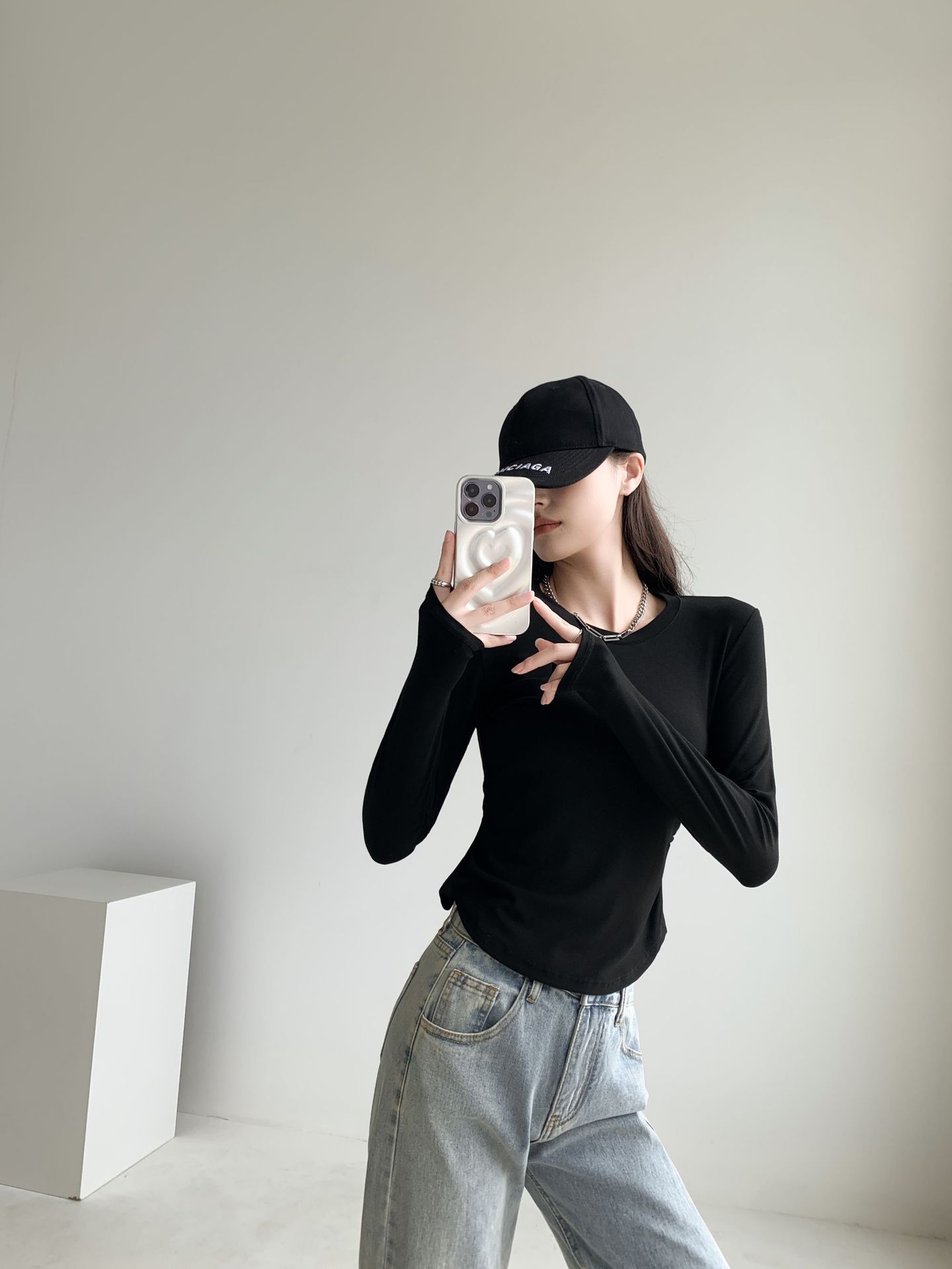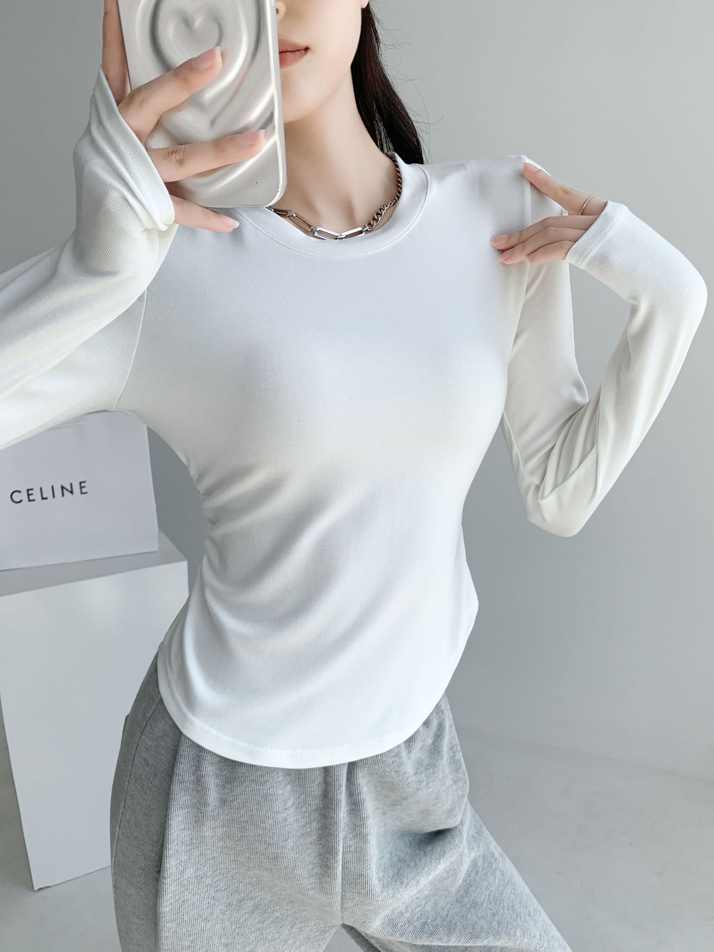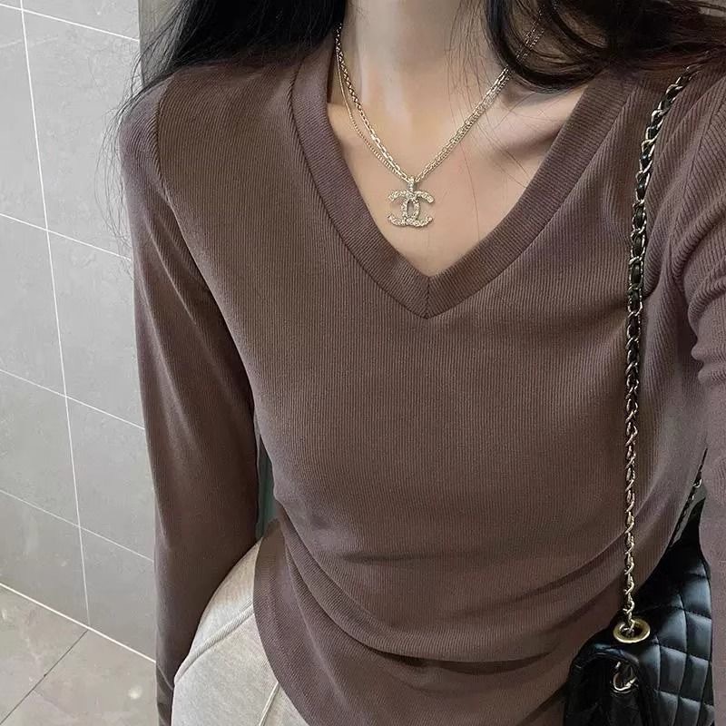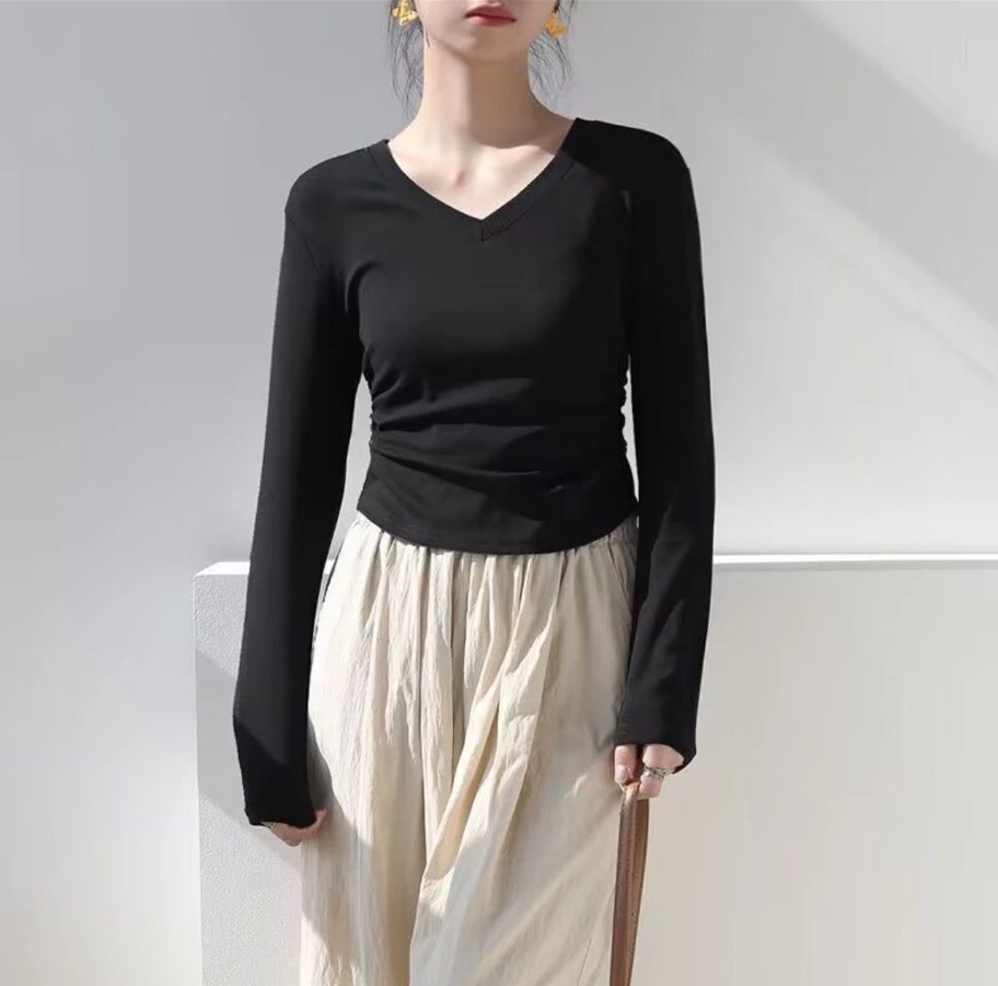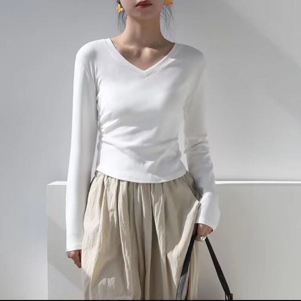 显瘦修身 气质百搭 纯白色秋季新款 小v领打底衫女 内搭洋气 纯欲正肩长袖t恤