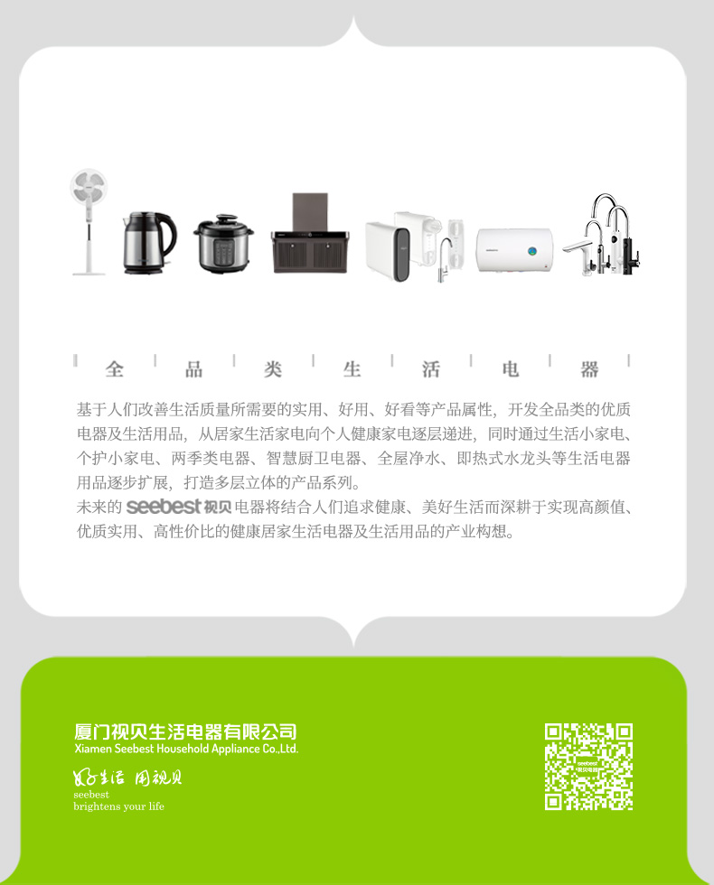 厦门视贝科技有限公司是集产品自主设计,研发,生产,销售于一体的高科技企业。拥有80000平方米的制造厂房,核心员工2000多人。产品线涵盖照明、电工,卫浴,线路,集成风暖等领域。