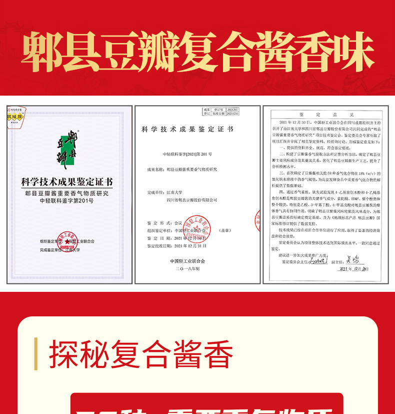 “鹃城牌“郫县豆瓣,中华老字号企业,源于1688年,国有控股公司,郫县豆瓣行业龙头企业和行业标准化生产示范工厂,中国非物质文化遗产郫县豆瓣传统制作技艺传承企业。 获“中华老字号”、“中国非物质文化遗产