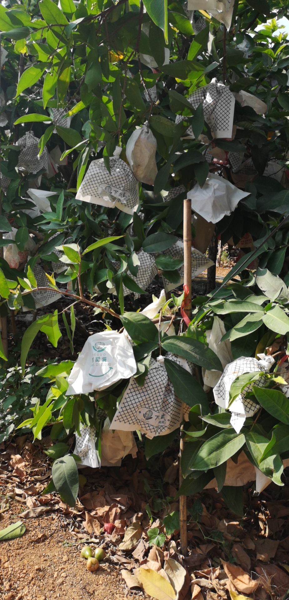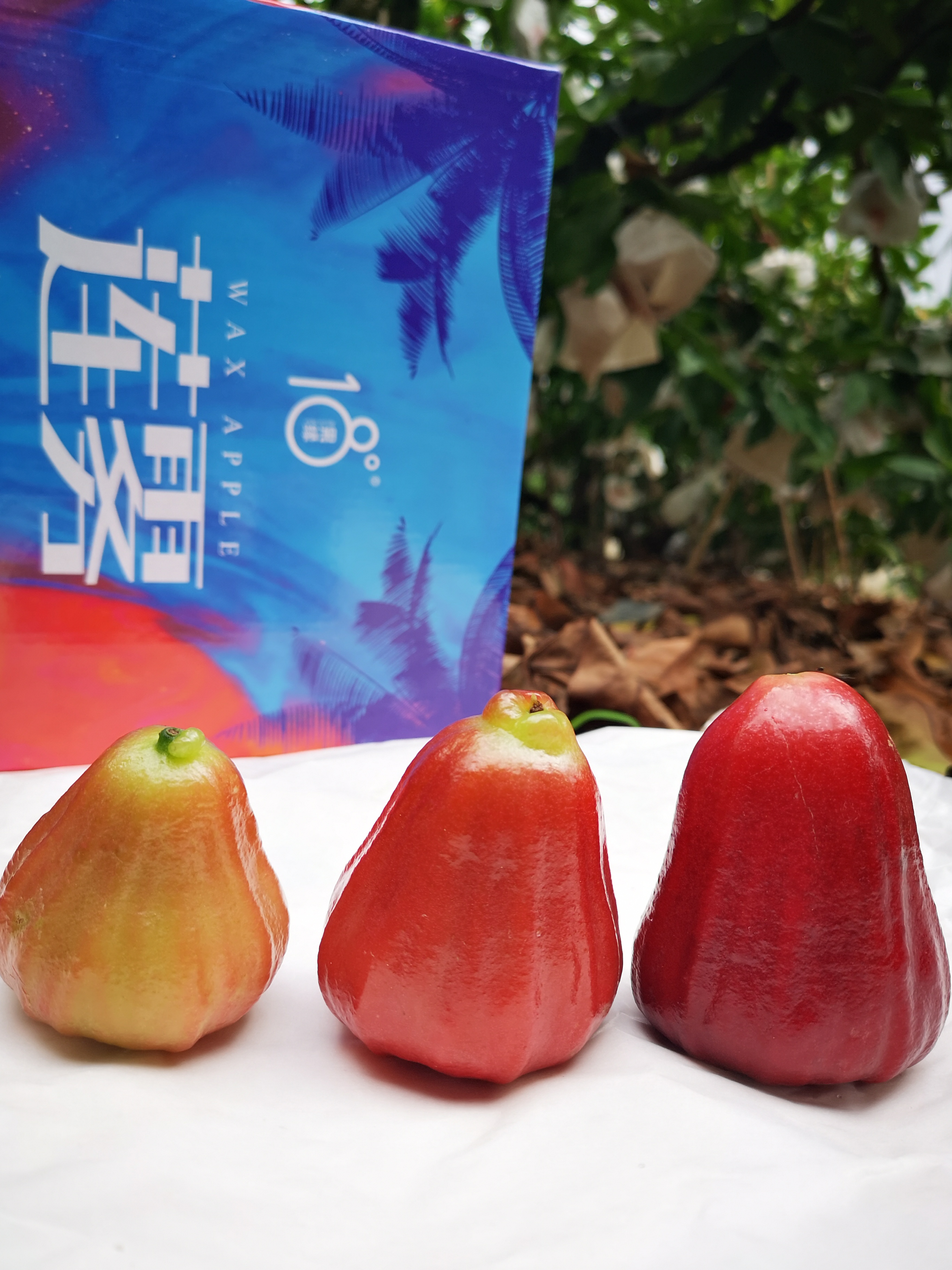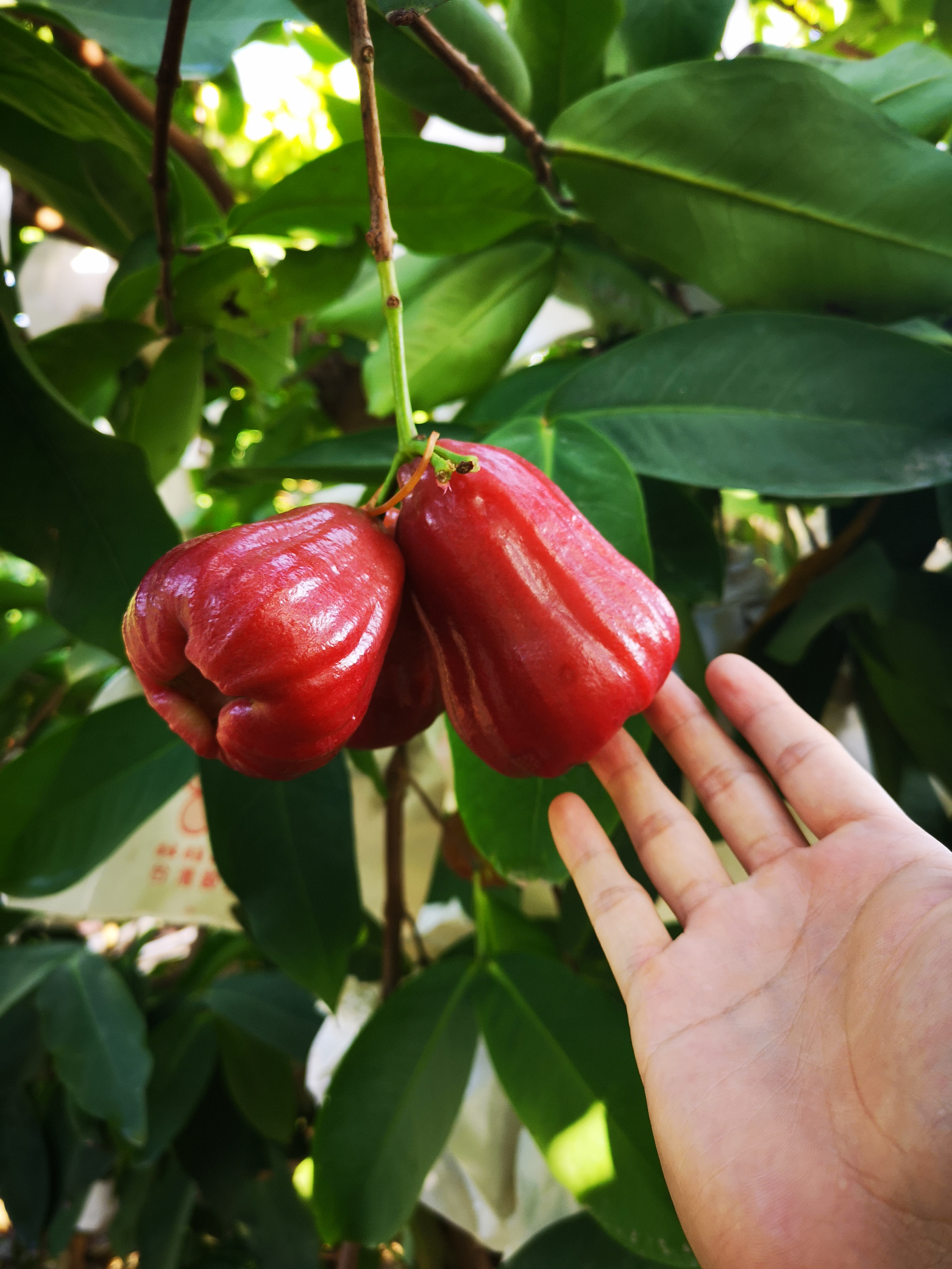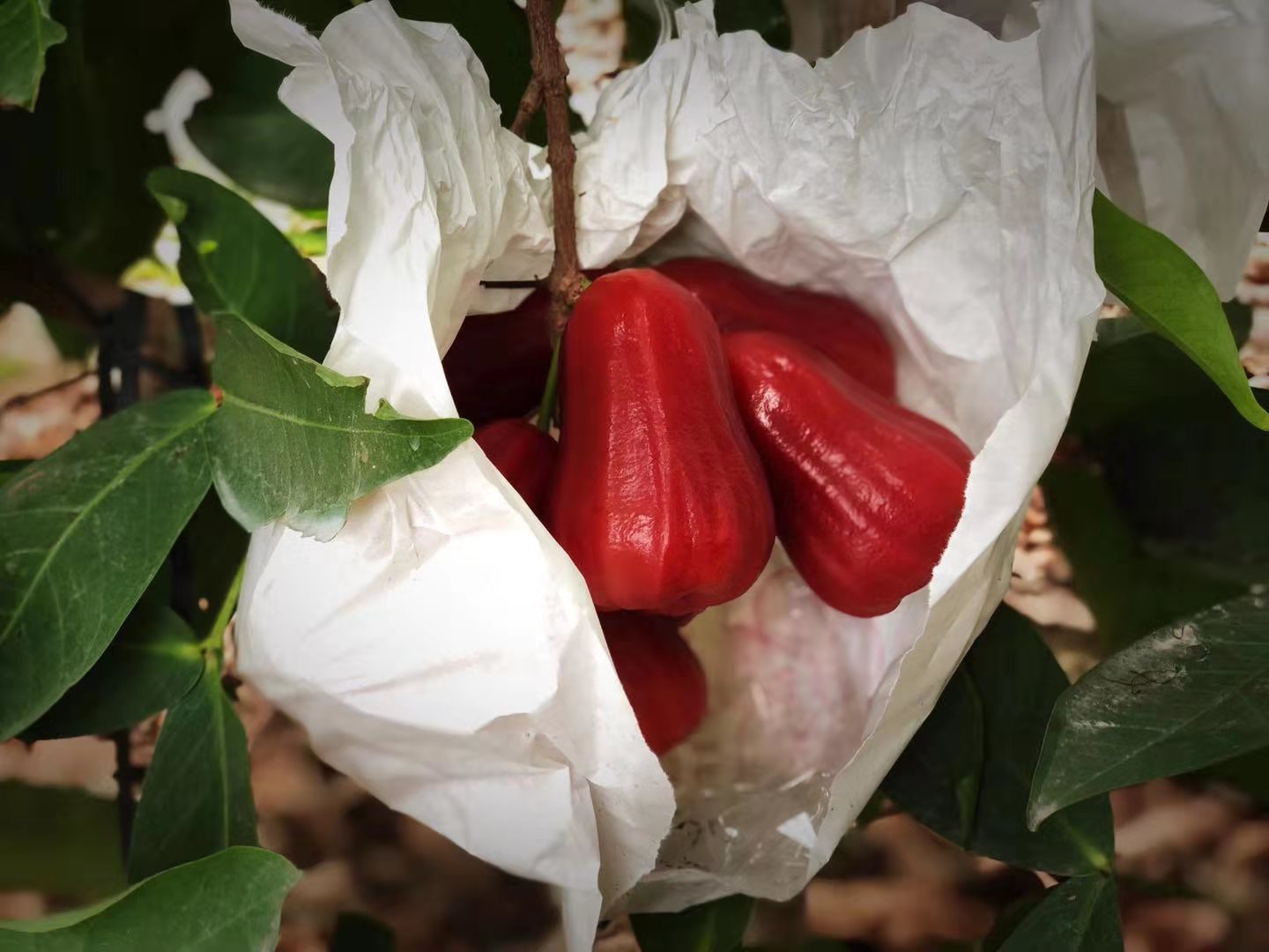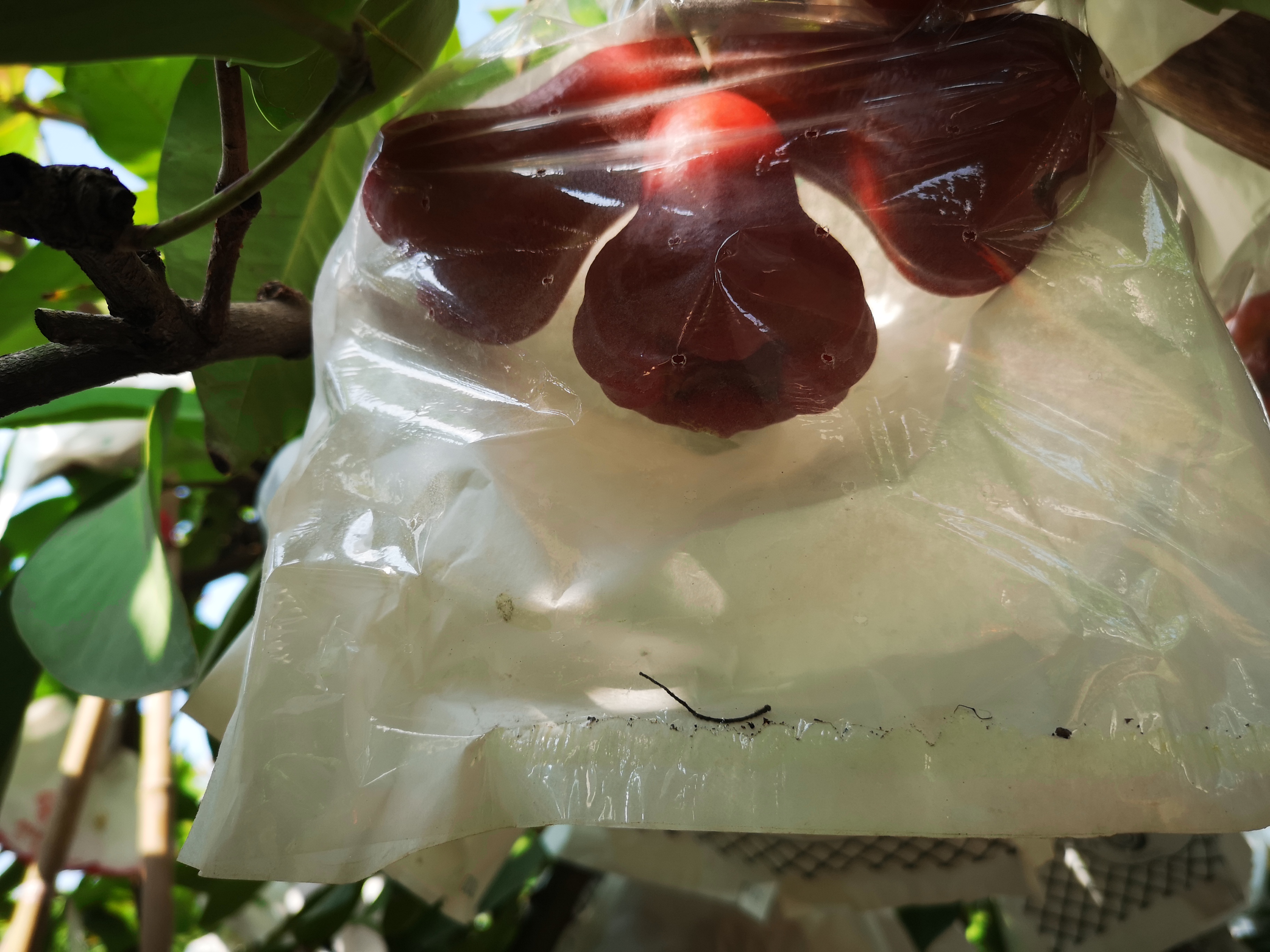 所有的莲雾我们都会套袋,从而避免鸟害虫害、农药残留。套袋后果子成熟了需要工人一颗颗果子查看,挑选采摘,在我们套袋时,为了保证果子的品质,我们会进行一次疏果,使果树达到合理的叶果比。