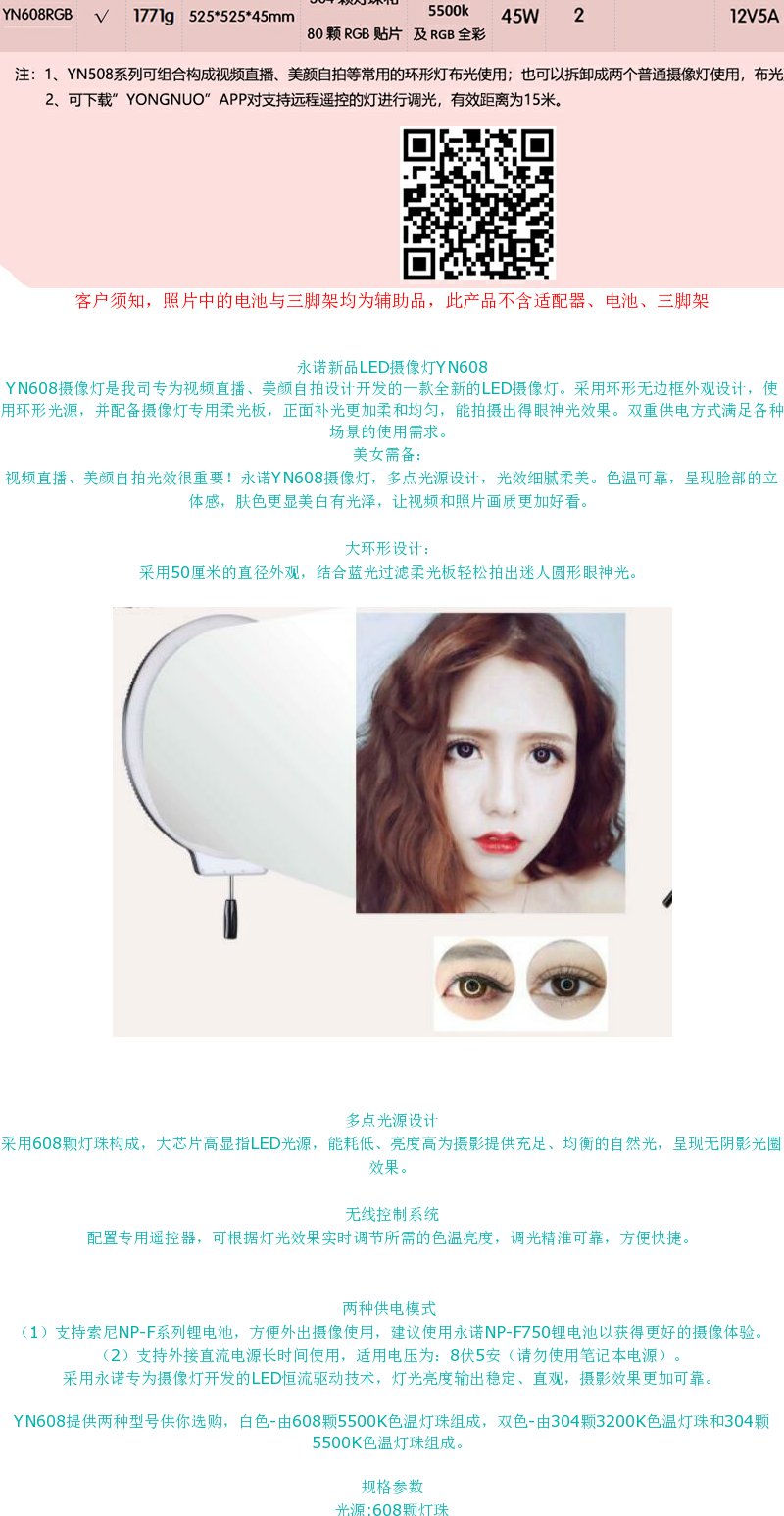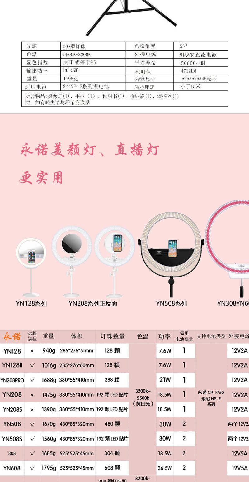 永诺 YN608 LED环型摄影灯补光灯人像室内打光拍摄美颜美妆直播 配电源适配器 单色