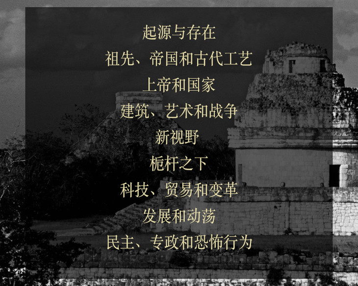 作者没有采用传统编年史写法,而是把人类历史分为9个时代,每个时代选择10个左右的代表性专题事件说明。