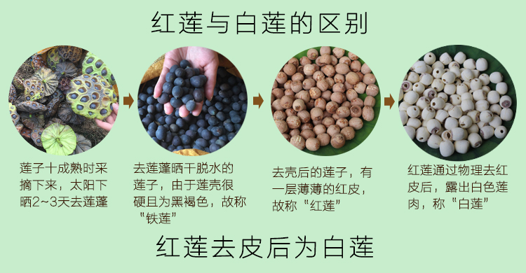 红莲表面的白色纹路为加工时留下的滚刀印记,手工红莲表面的条状痕记为刀割印记,并非品质问题;磨皮白莲未熏硫,颜色偏黄为正常现象。