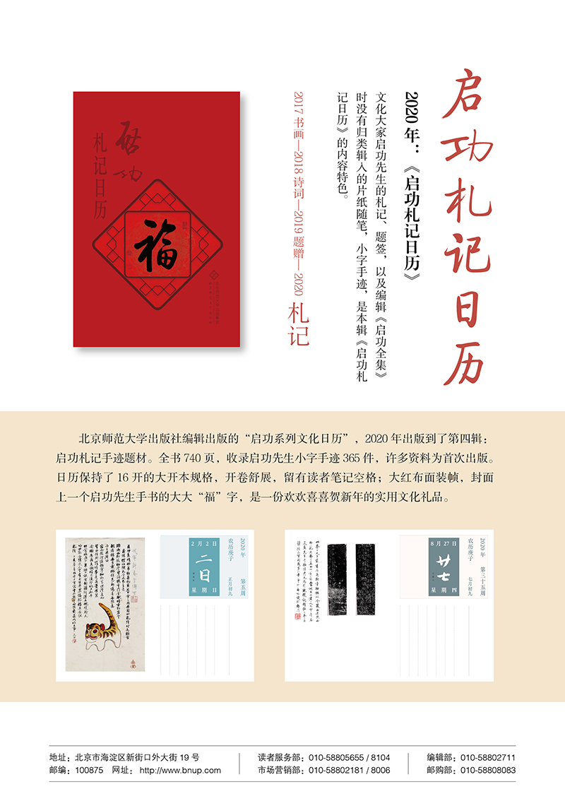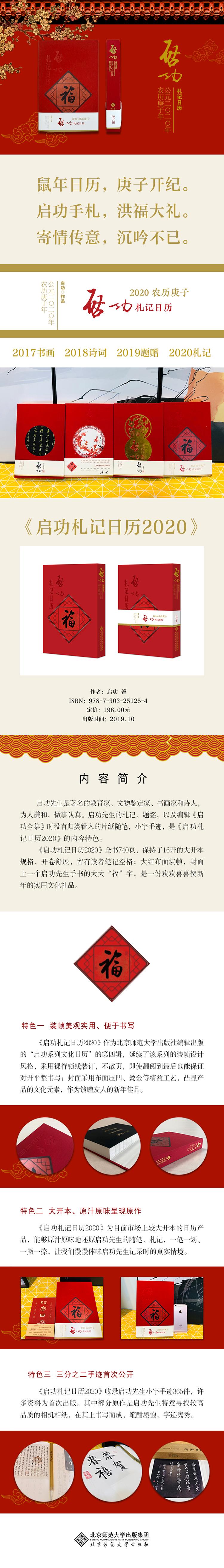 《启功札记日历2020》作为北京师范大学出版社编辑出版的“启功系列文化日历”的第四辑,延续了该系列的装帧设计风格,采用裸脊锁线装订,不散页,即使翻阅到最后也能保证对开平整书写;封面采用布面压凹、烫金等精益工艺,凸显产品的文化元素,作为馈赠友人的新年佳品。