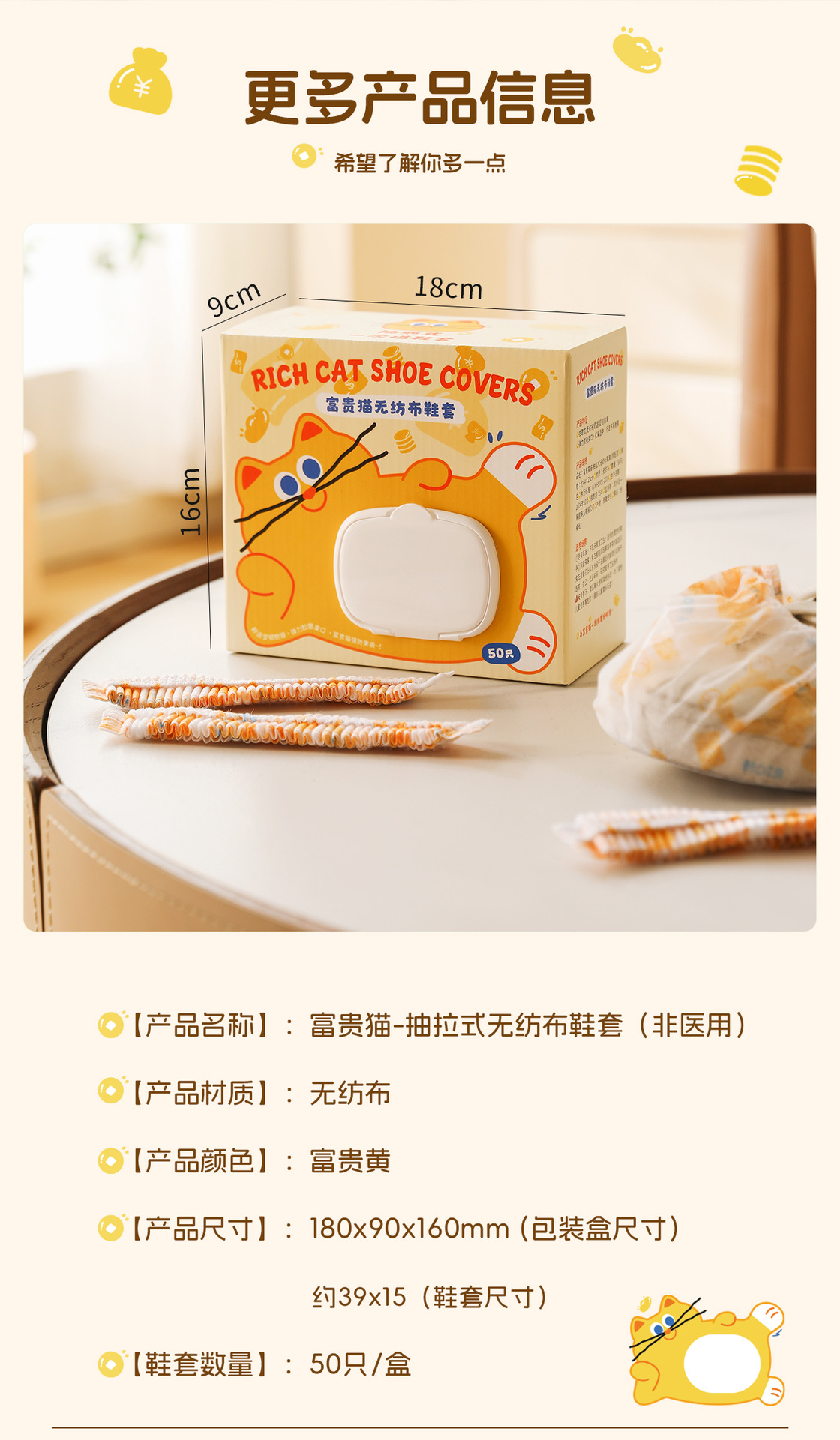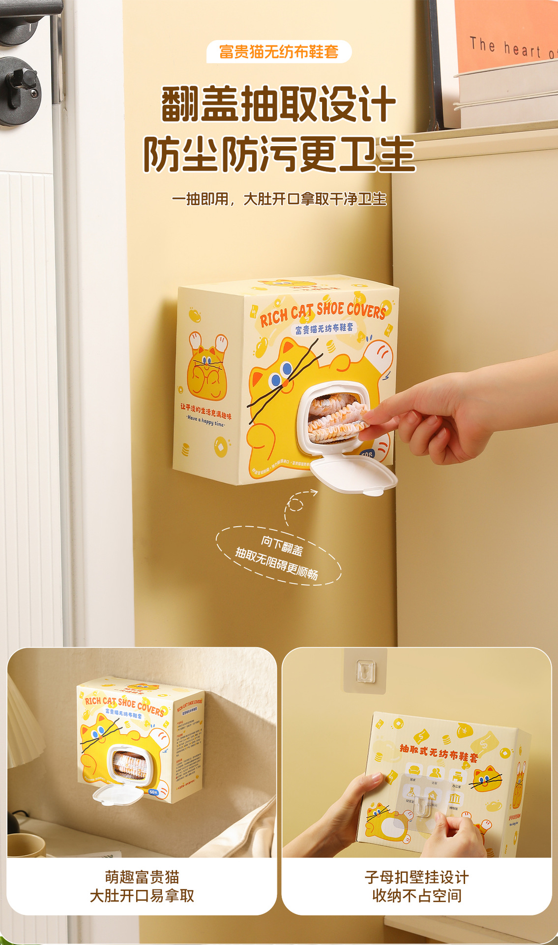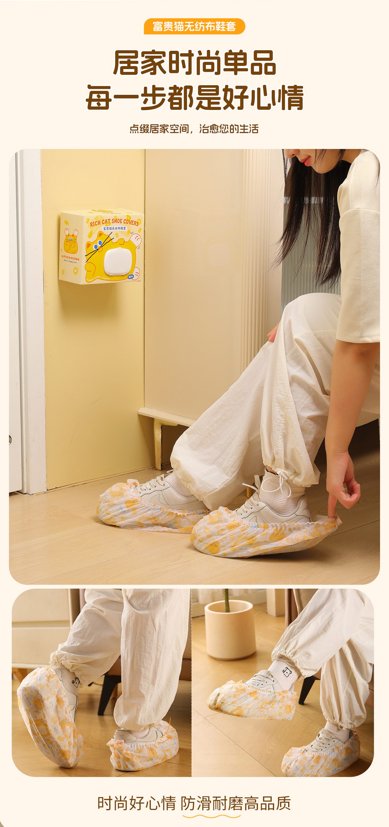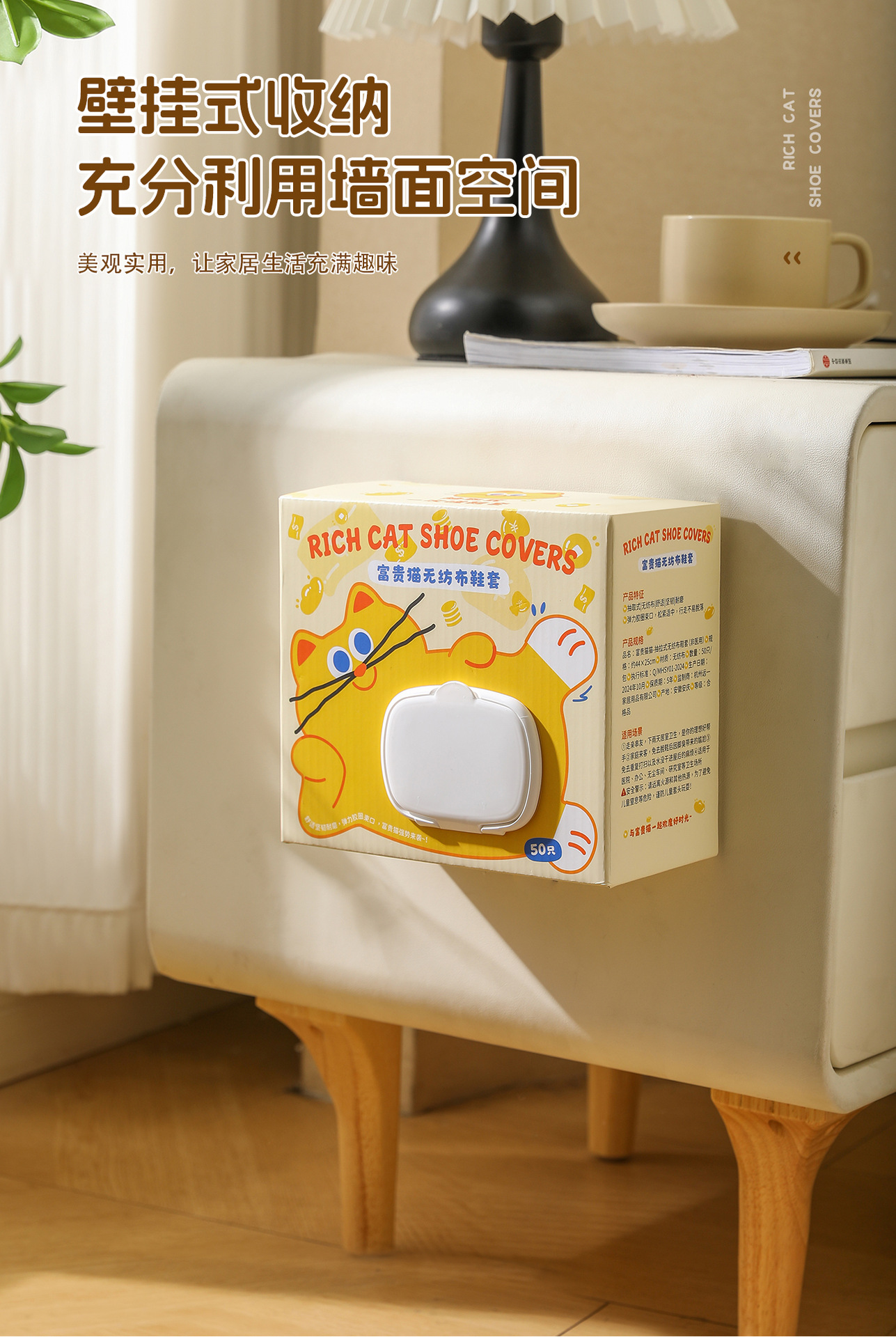 原创图案【壁挂式 100只加厚无纺布鞋套 】富贵猫鞋套 家用客人用加厚耐磨神器 室内一次性厚款反复用鞋套