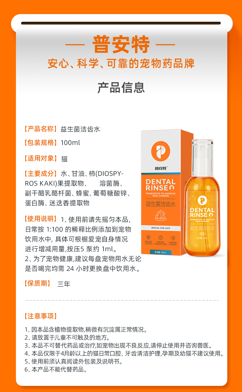 【49元任选3件】普安特宠物猫咪洁牙洁齿水益生菌口臭口腔清洁牙结石洁牙(限购1件)