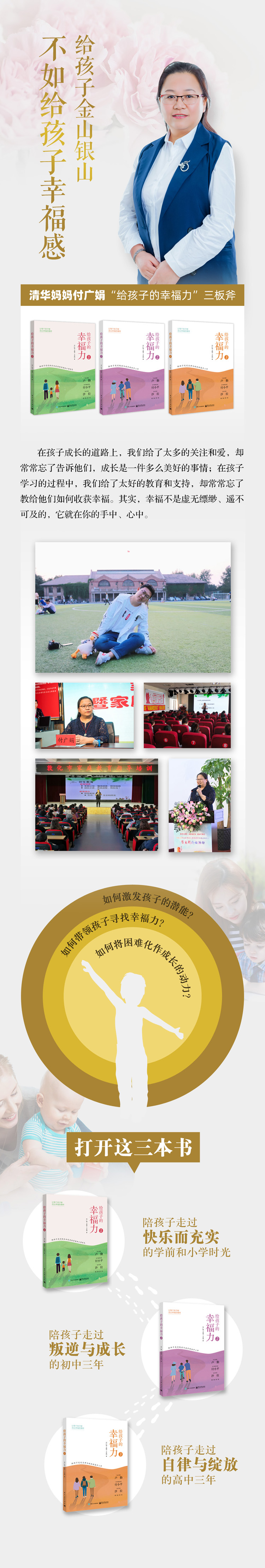 付广娟她是一名幸福的老师。在教育一线深耕细作二十六年,做了二十年班主任工作,收获了累累硕果:吉林省长春市实验中学*级教师,吉林省语文学科带头人,长春市“十佳教师”,长春市*秀班主任。她的“快乐语文”教学法,让学生既收获了知识,又学会了做人。她做班主任的理念是:做学问之前先做好人。她用心**学生成长成才,培养他们终生受益的品格,赢得了学生的喜爱、家长的信任。她是一位幸福的妈妈。她,2018年被评为吉林省*美家庭标兵,吉林好人。她的家庭,2019年被评为全国*美家庭。她提出了科学家庭教育理念:伴生教育!她用伴生教育陪伴孩子20年,坚持记录孩子成长的点滴。孩子健康、快乐,有责任、懂担当,2017年考入清华大学。在她的字典里,孩子的幸福与快乐是*重要的。读她和孩子之间的故事,幸福又温暖。她是一名幸福的公益人。她,2018年被评为吉林省*秀志愿者。作为*深的家庭教育专家,她在全国各地做了近千场讲座,在各大广播电台、电视台进行过上百次关于家庭教育的现场直播和录播。她有100多个家长群,定期分享微课与文章,受益家长十几万人。她于2017年成立了家庭教育公益组织——清北妈妈团,担任团长,带领团队做了两年多的公益沙龙,受益家长几百组。她的家庭教育梦想就是影响更多家长,成就更多家庭,幸福更多孩子,让每个家庭都幸福绵长。