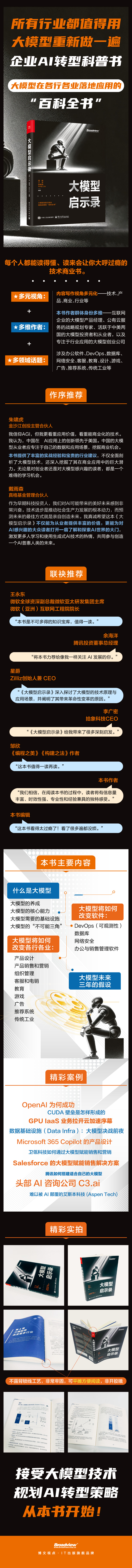 本书旨在成为大模型在各行各业落地应用的“百科全书”,专为对大模型感兴趣的从业者和企业管理者量身打造。本书结合了实地调研和多元视角,不仅对大模型进行了技术分析,还从商业、产品、行业等多个角度进行了应用探讨。全书共5章:第 1 章介绍了大模型的训练过程和核心技术;第 2 章分析了大模型对软件行业的影响,通过具体案例展示了软件公司如何适应大模型需求;第 3、4 章分别从产品和行业角度出发,讨论了大模型如何改变产品升级流程和工作流程,以及它对各行各业的具体影响;第 5 章展望了大模型的未来,预测了它将如何改变我们的世界。本书由互联网企业的大模型产品经理、公有云服务的战略规划专家、活跃于中美两国的大模型投资者和从业者,以及专注于行业应用的大模型创业公司共同参与创作。本书将为从业者提供如何选择合适的大模型产品,以及大模型将如何影响其所在行业的深入分析。对于企业管理者,本书将探讨企业如何有效实施大模型应用,以及如何调整现有业务流程以适应 AI 技术的变革,帮助读者更快地接受大模型技术,并提前规划 AI 转型策略。