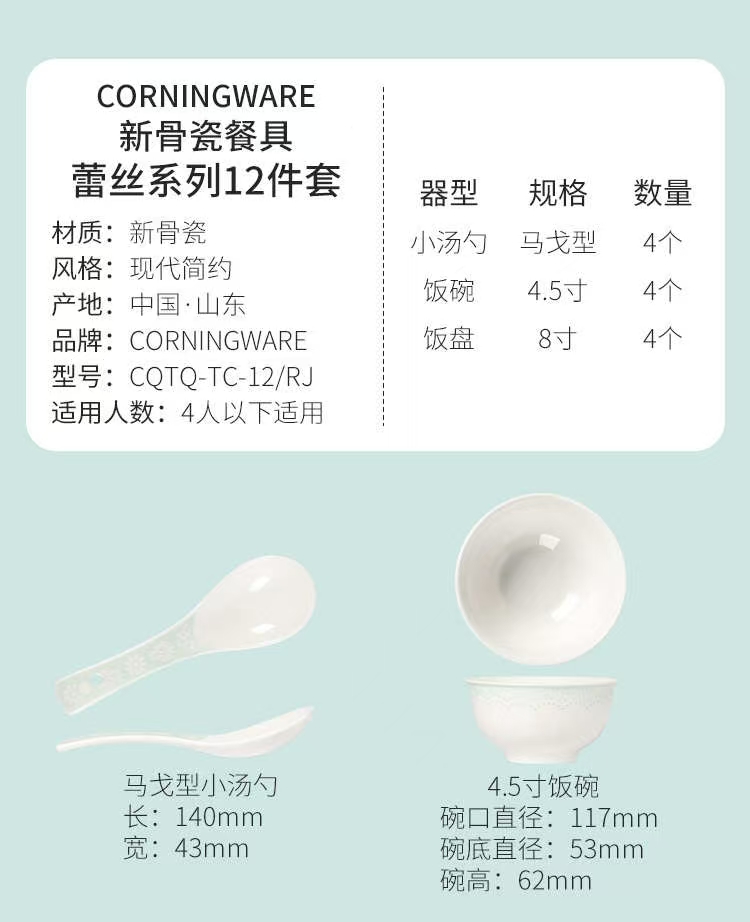 康宁CORNINGWARE 新骨瓷餐具 浮雕蕾丝系列12件套