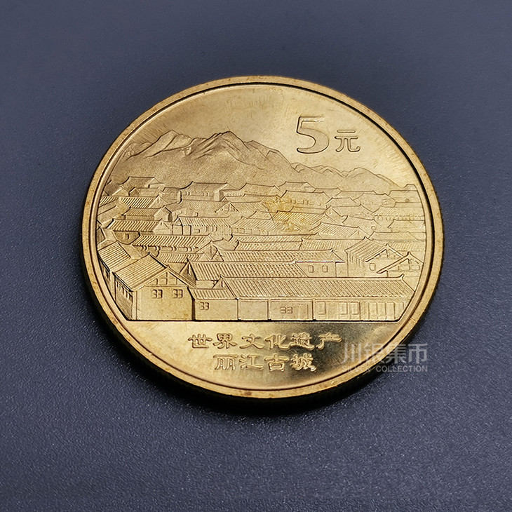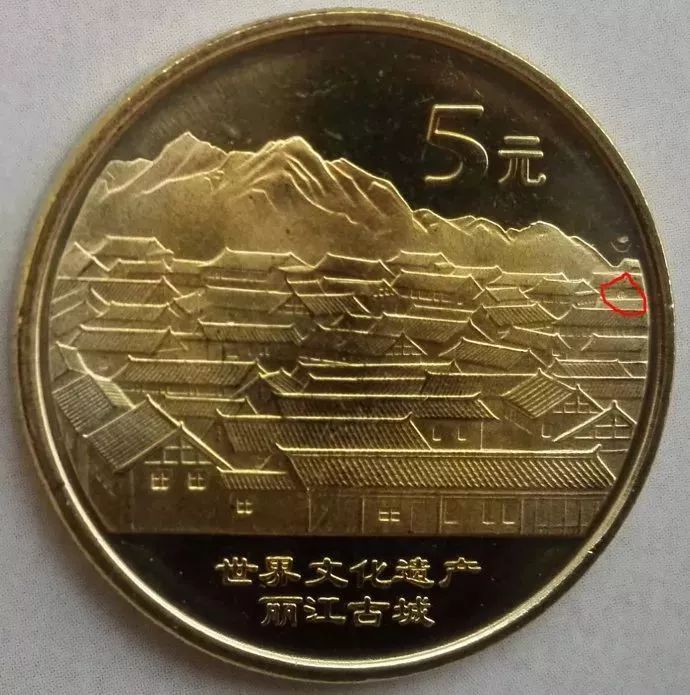 7:丽江古城纪念币,面值5元,发行量800万枚,发行日期2005年;