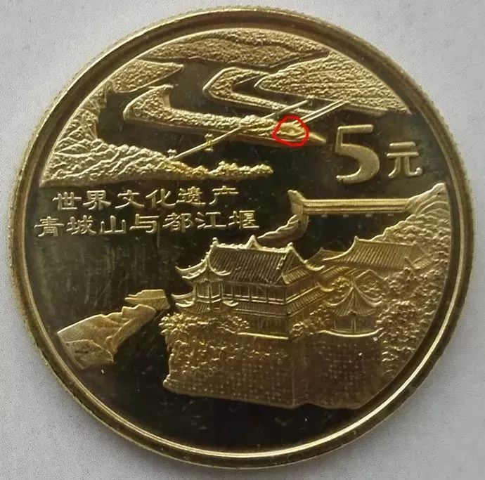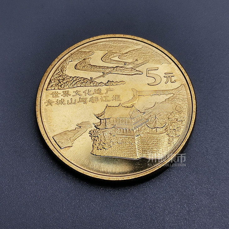 8:青城山与都江堰纪念币,面值5元,发行量800万枚,发行日期2005年;