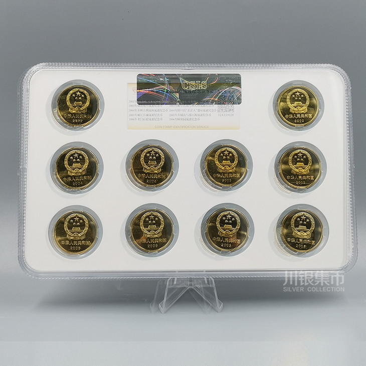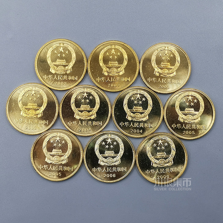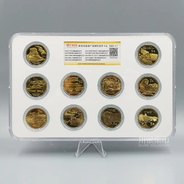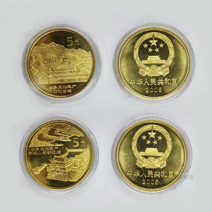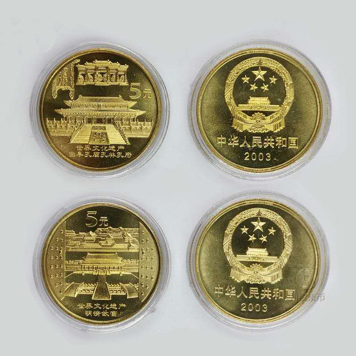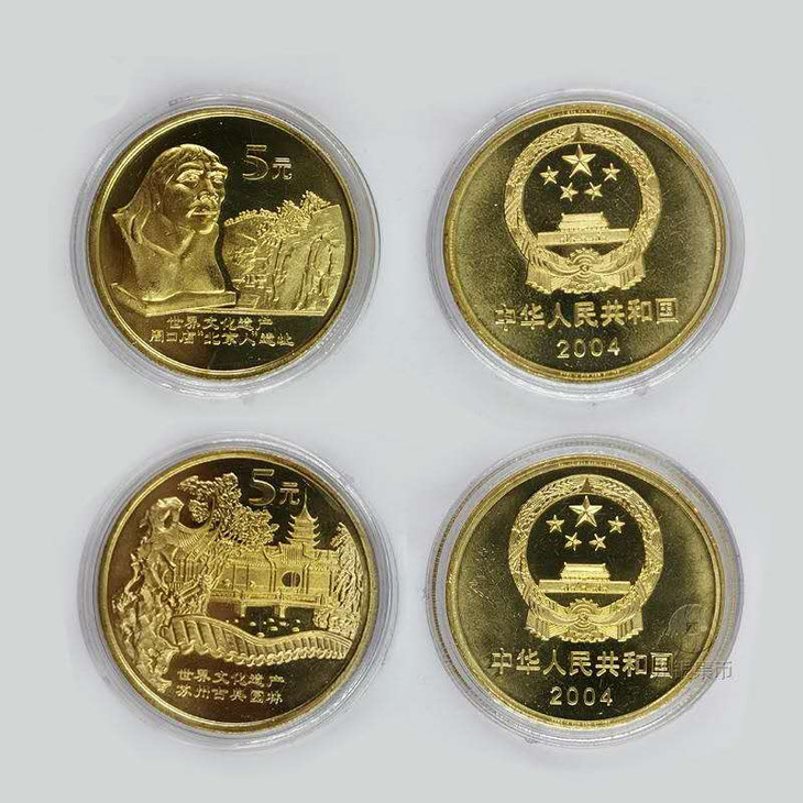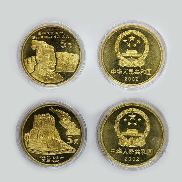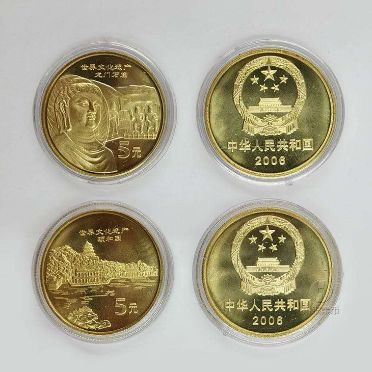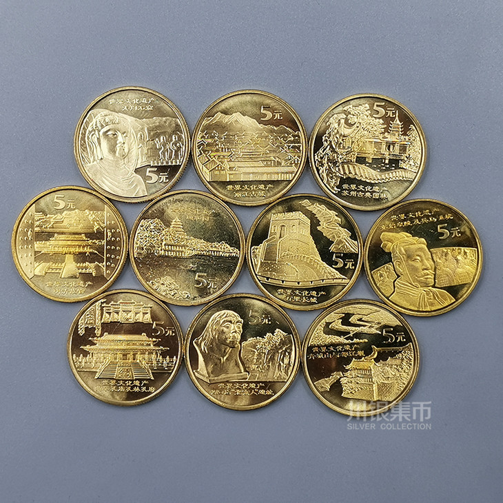 中国人民银行发行了五组10枚《世界文化遗产流通纪念币》,从2002年开始至2006年,该系列流通纪念币,大气磅礴,基本囊括了中国大型的历史文化遗产,每枚纪念币面额5元,直径30mm,厚度2.5mm,材质为黄铜合金
