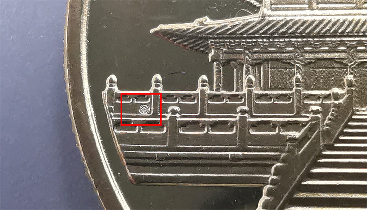 暗记位置在币的中间左侧石狮子腿部,刻有世界遗产标志暗记。