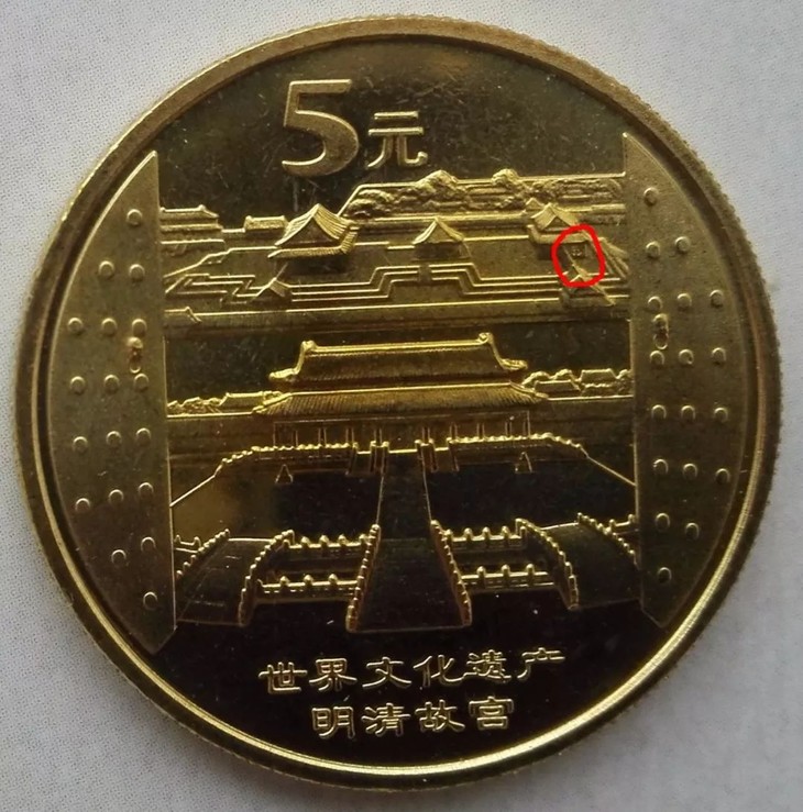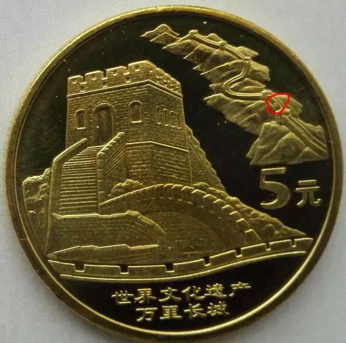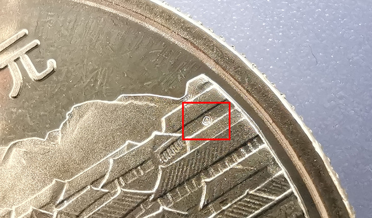暗记位置在2点钟方向,币面远处连绵长城上第四与第五烽火台之间的城墙上,刻有世界遗产标志暗记。